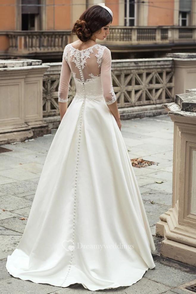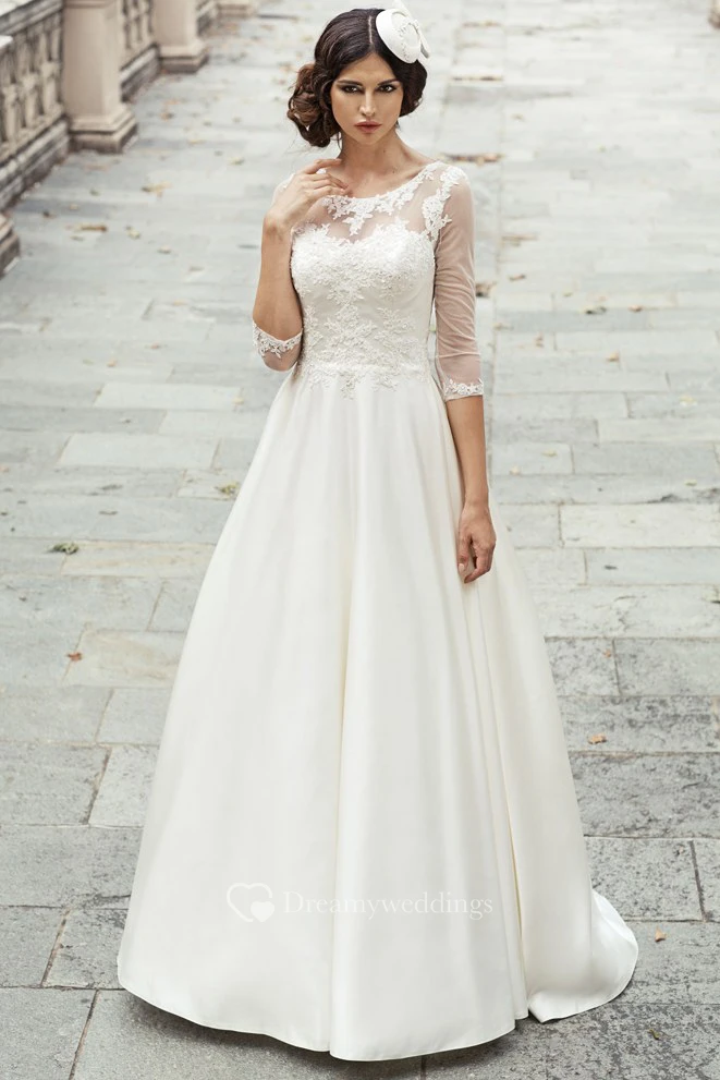 A-Line Long 3-4-Sleeve Appliqued Scoop-Neck Satin&Lace Wedding Dress