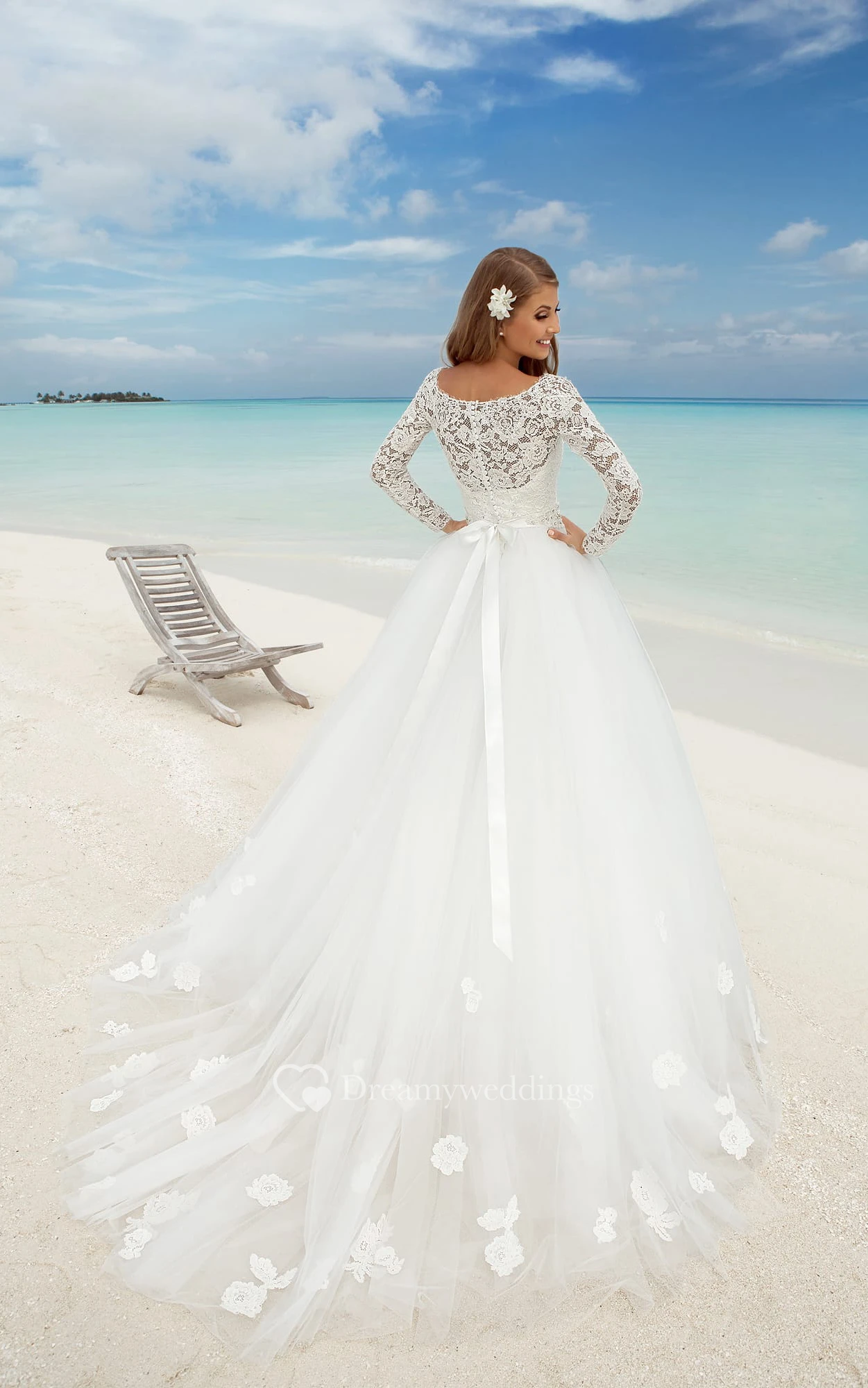 A-Line Long Bateau-Neck Illusion-Sleeve Illusion Tulle Dress With Bow And Sash