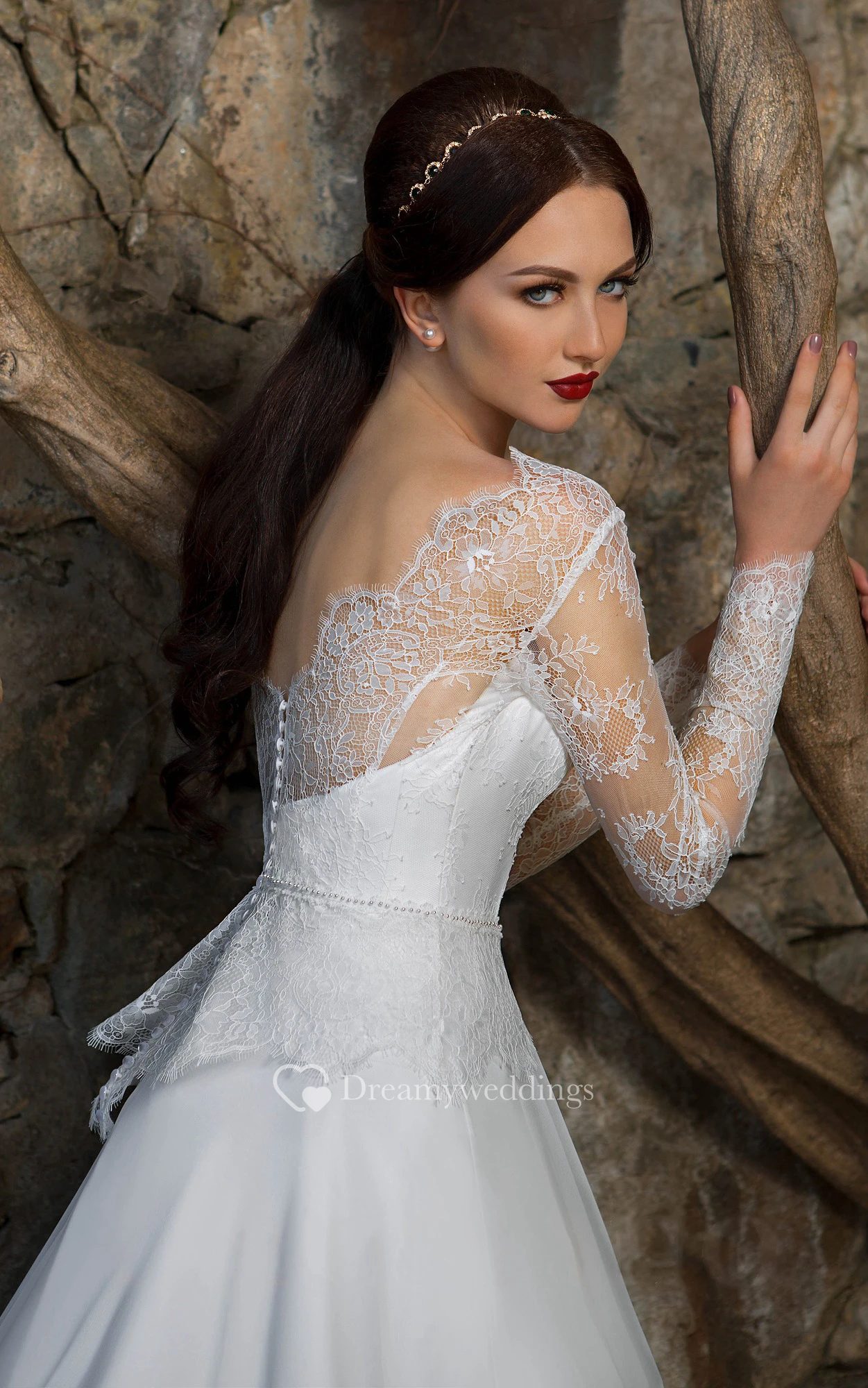A-Line Long High-Neck Illusion-Sleeve Zipper Chiffon Dress With Lace Appliques And Pleatings