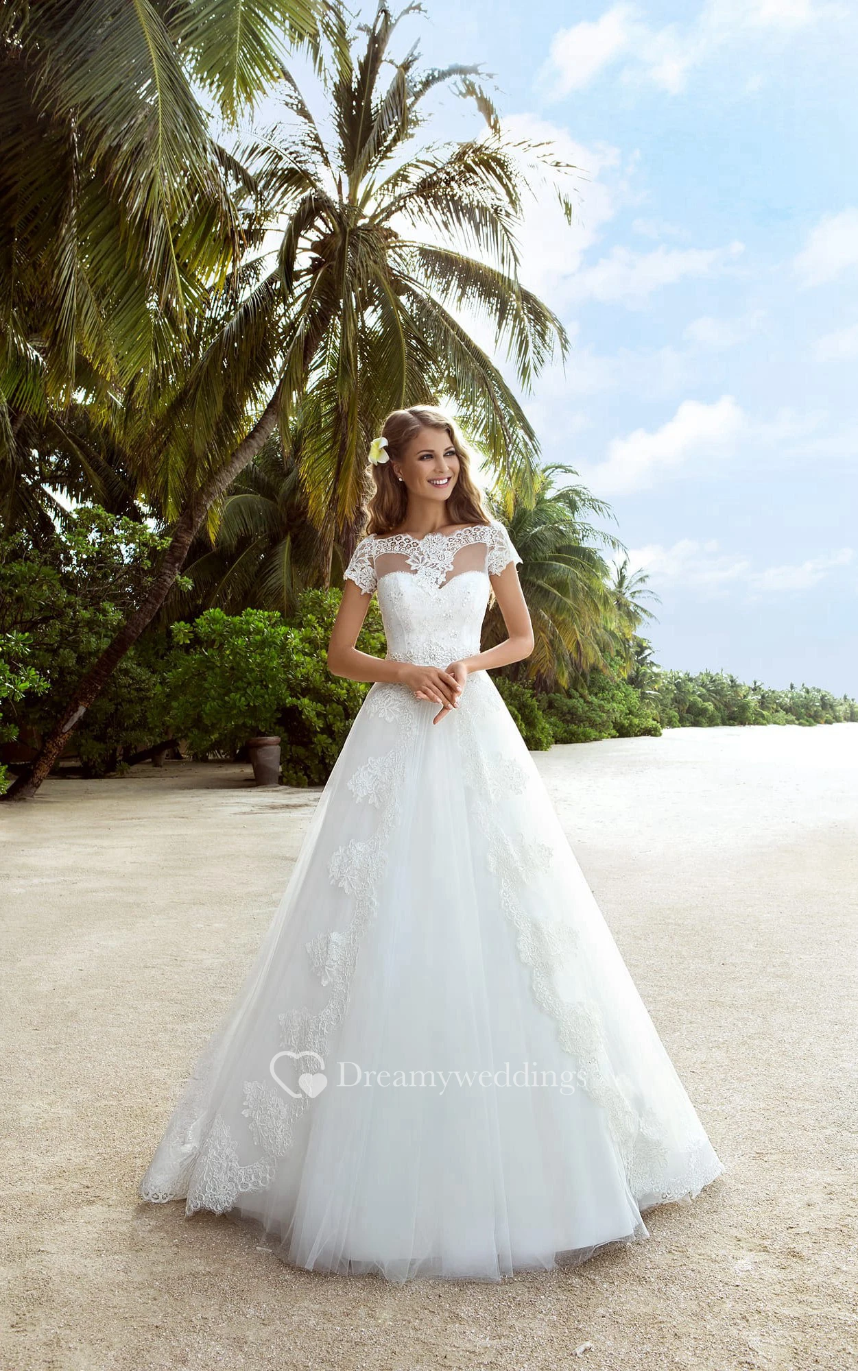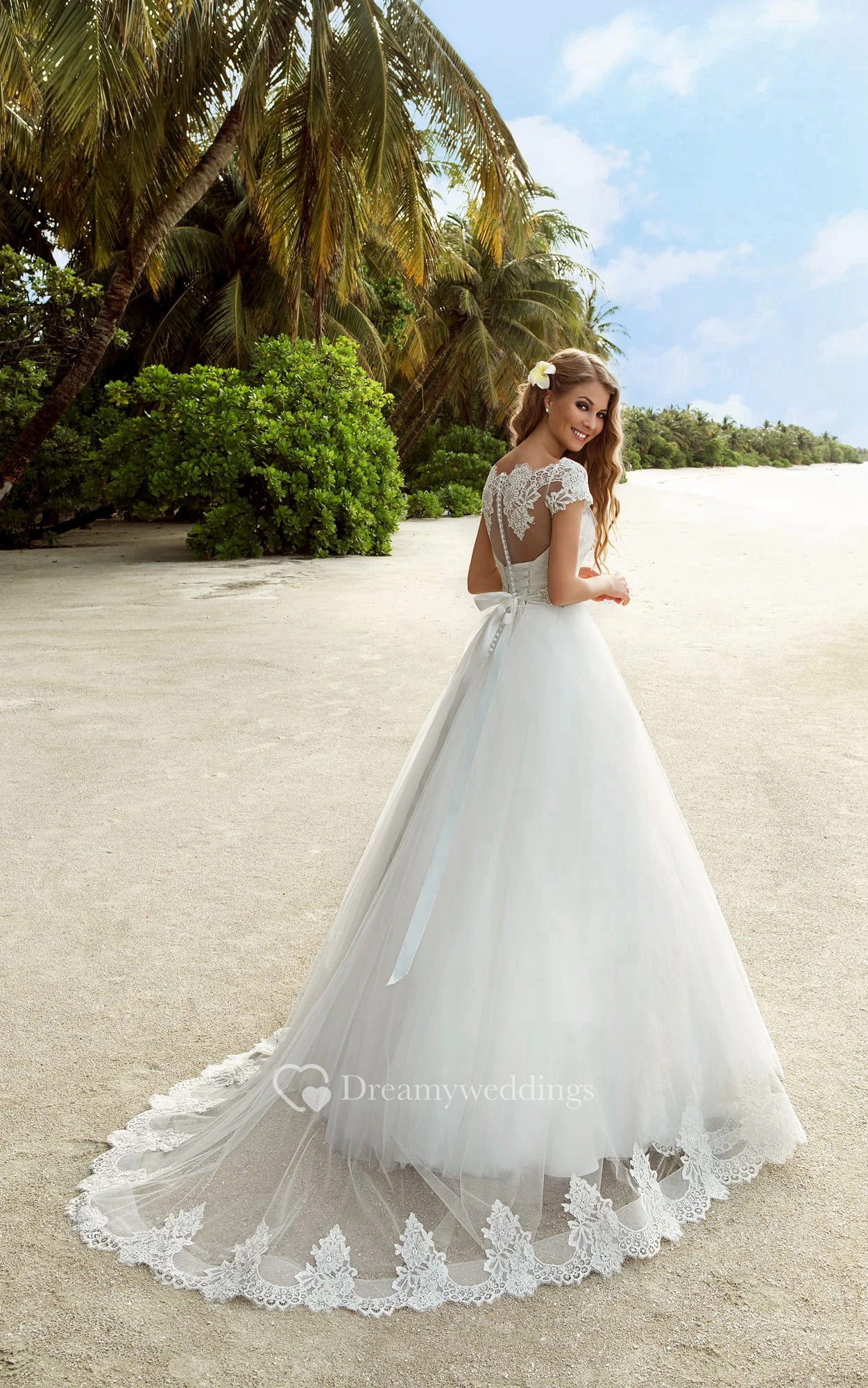 A-Line Long Off-The-Shoulder Cap-Sleeve Lace-Up Tulle Dress With Appliques And Beading