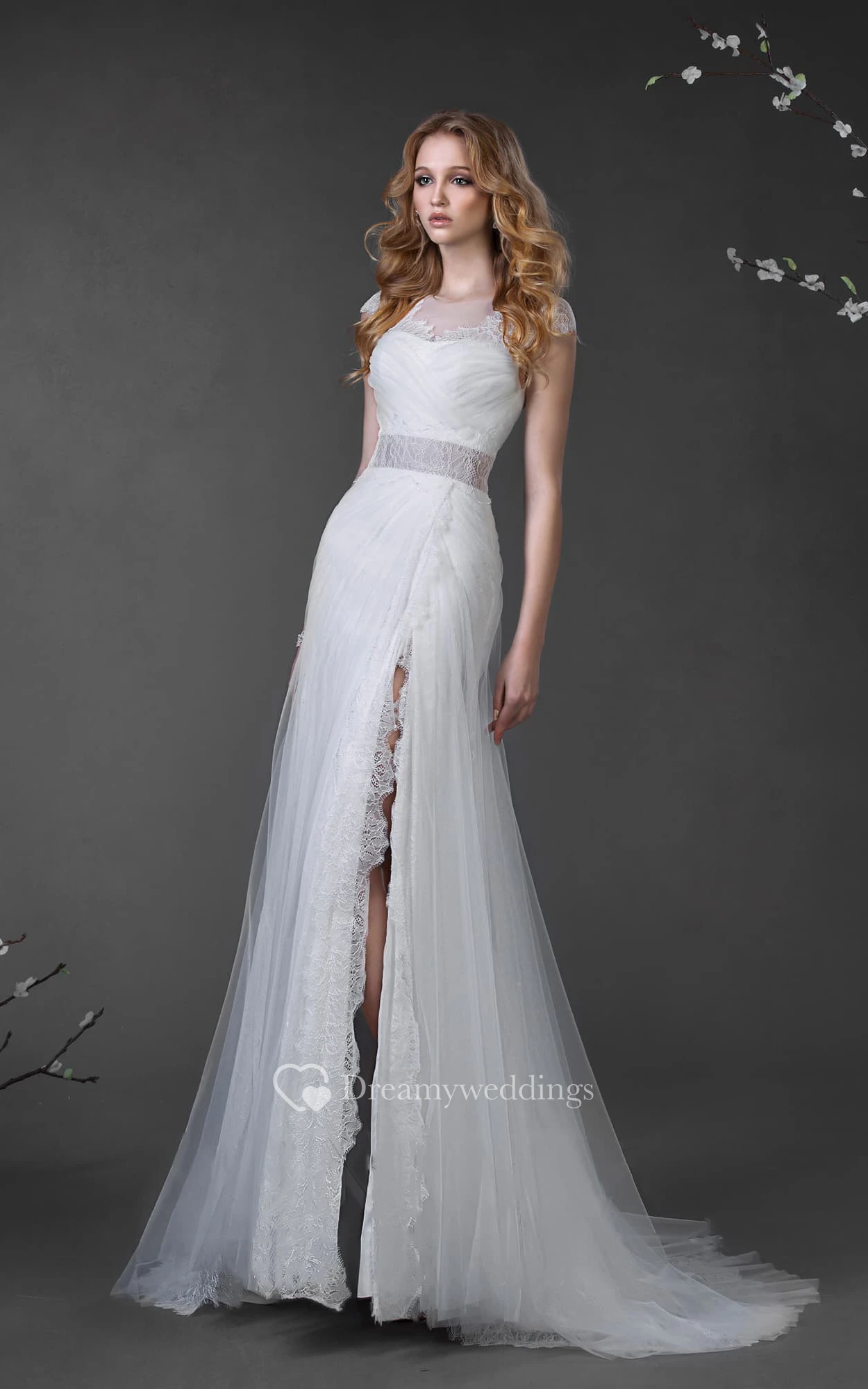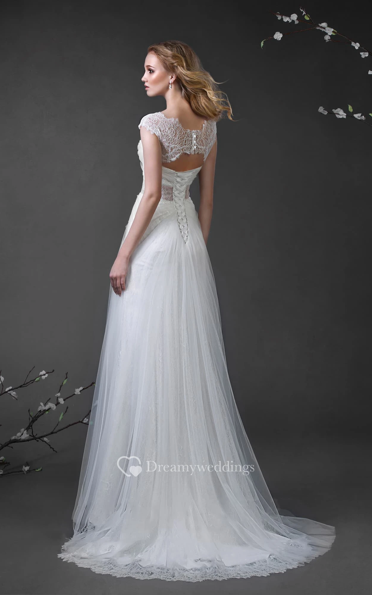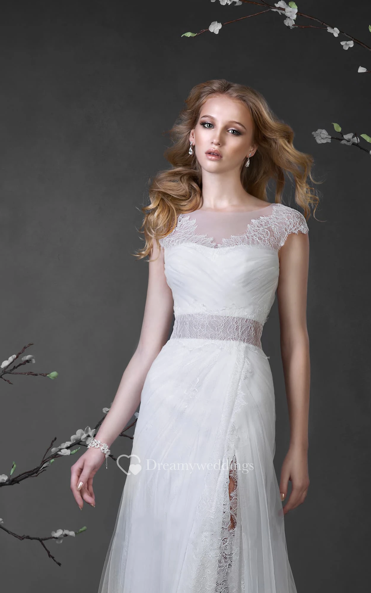 A-Line Long Scoop Cap-Sleeve Corset-Back Tulle Dress With Split Front And Lace