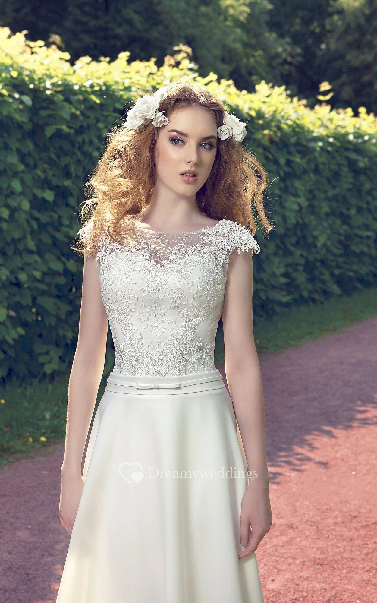 A-Line Long Scoop-Neck Cap-Sleeve Corset-Back Chiffon Lace Dress