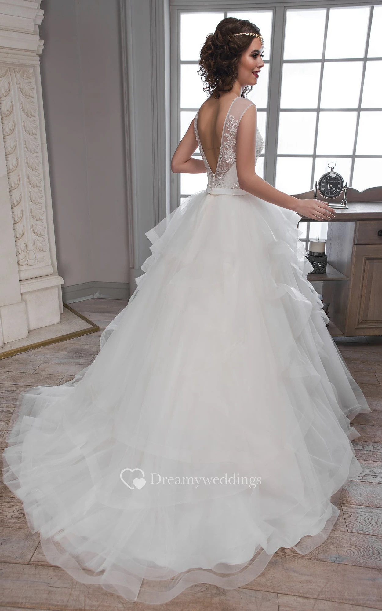 A-Line Long Scoop Sleeveless Deep-V-Back Tulle Dress With Ruffles And Beading