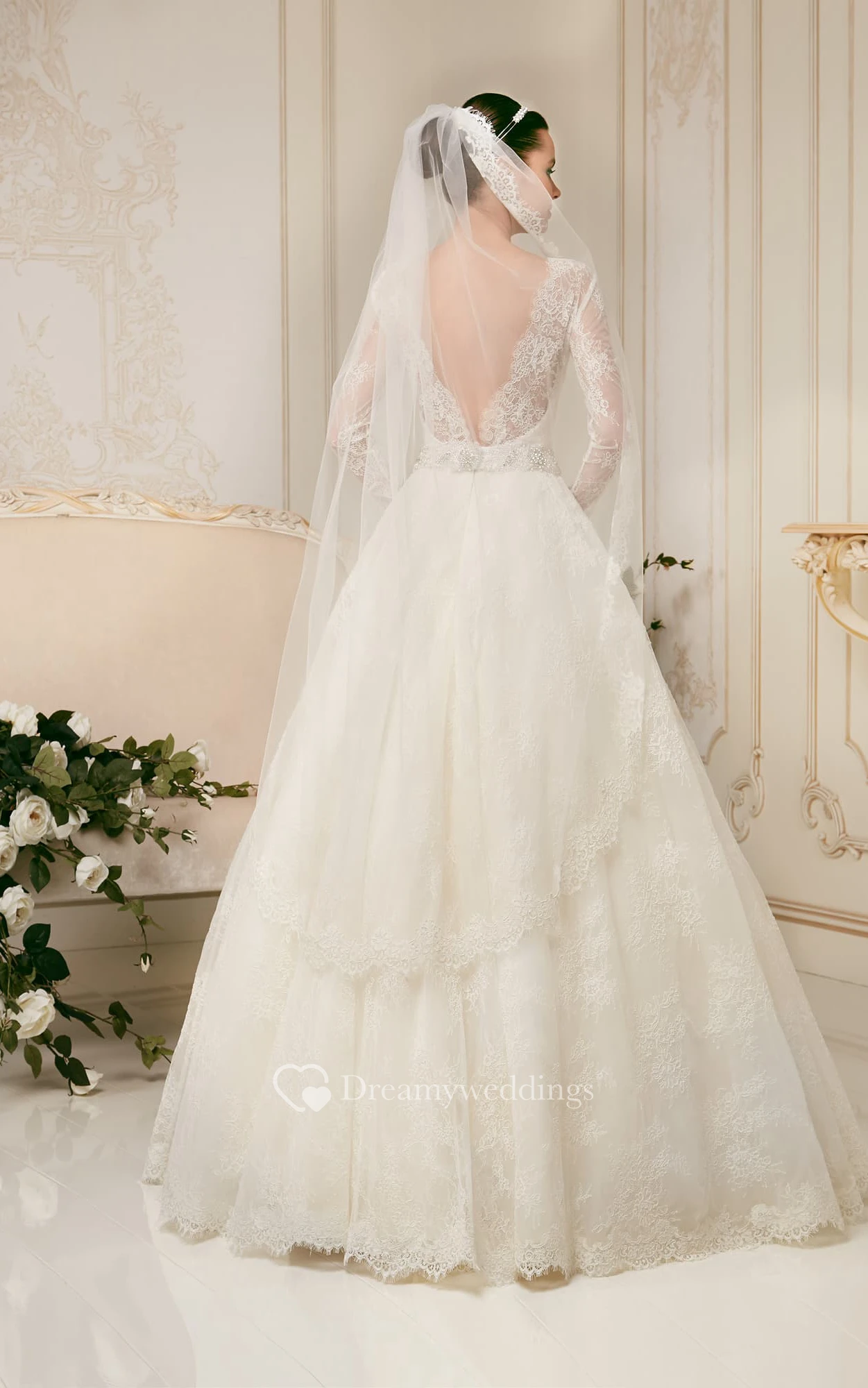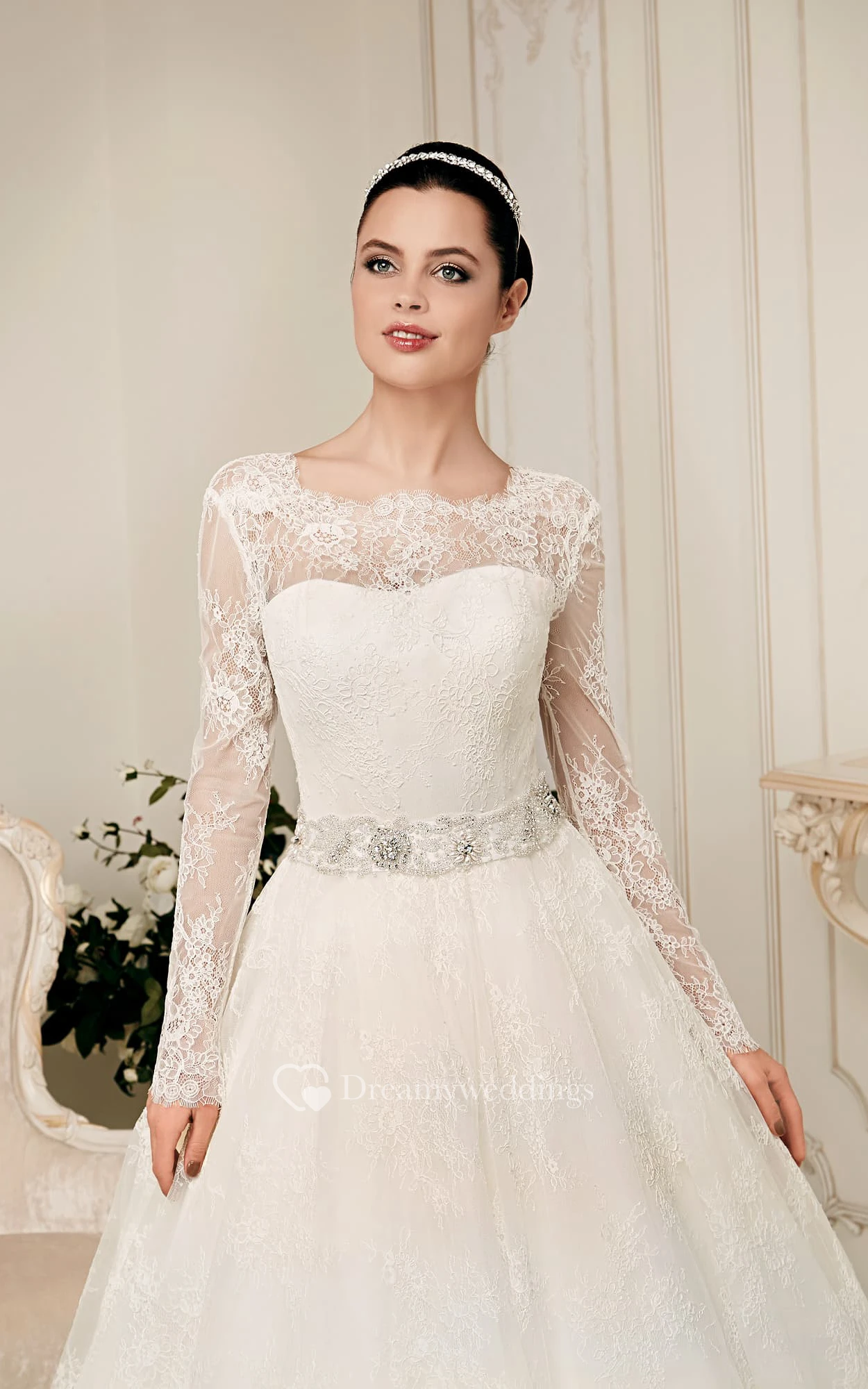 A-line Long Sleeve Low-V Back Bateau Lace Dress