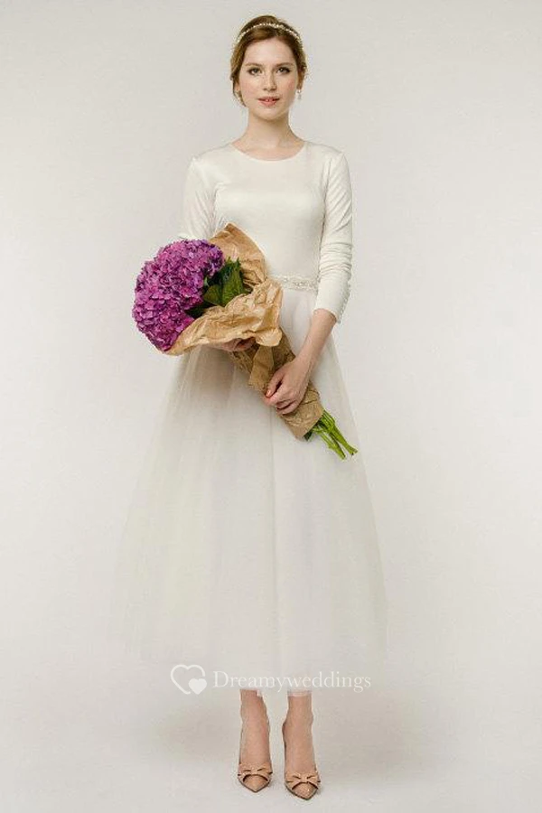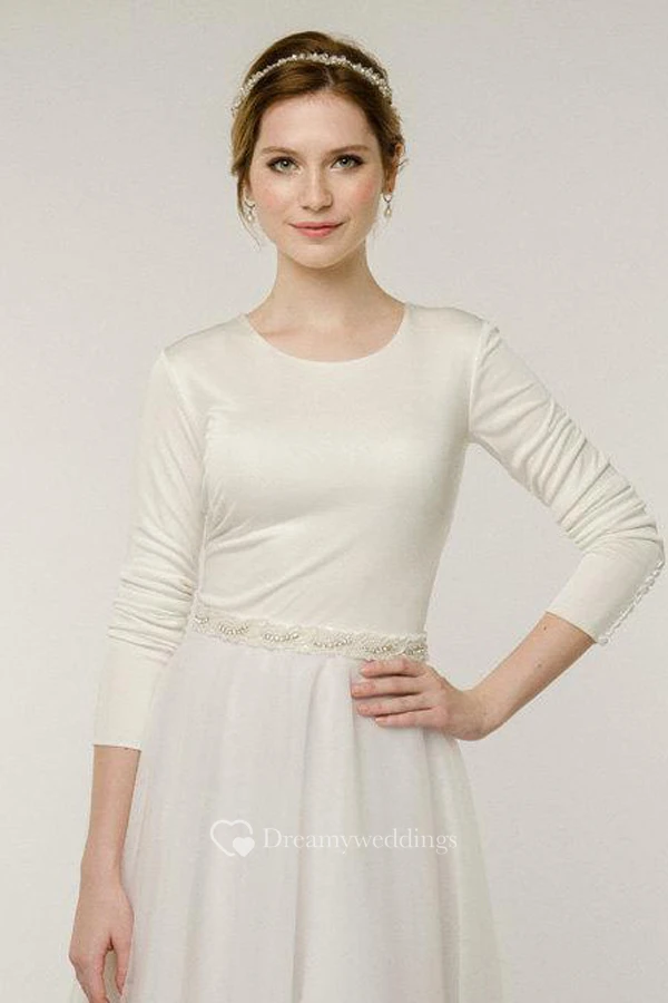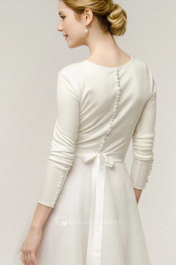 A-Line Long Sleeve Tulle Button Wedding Dress