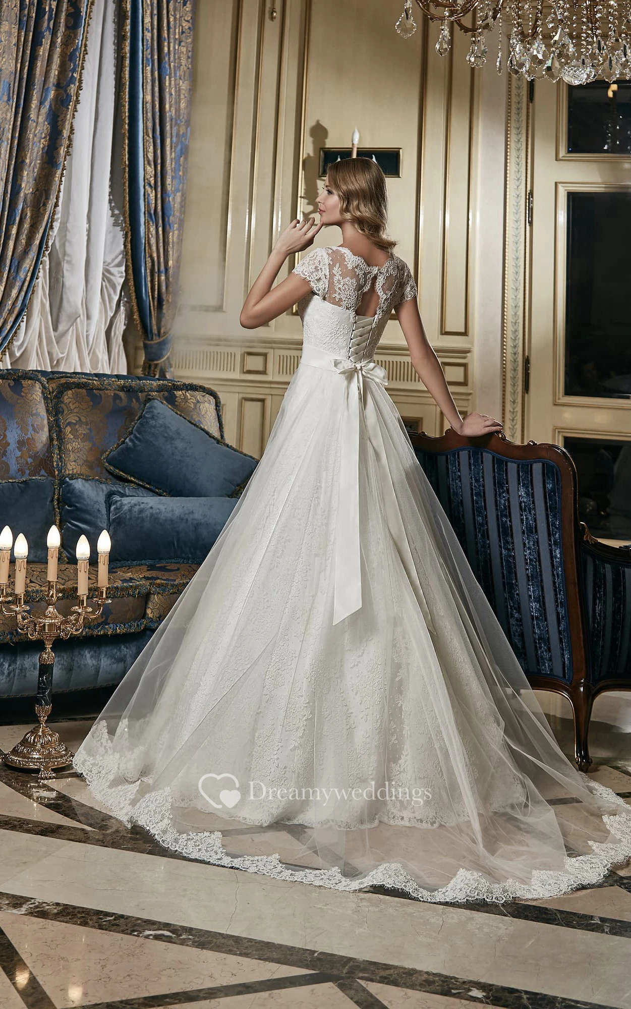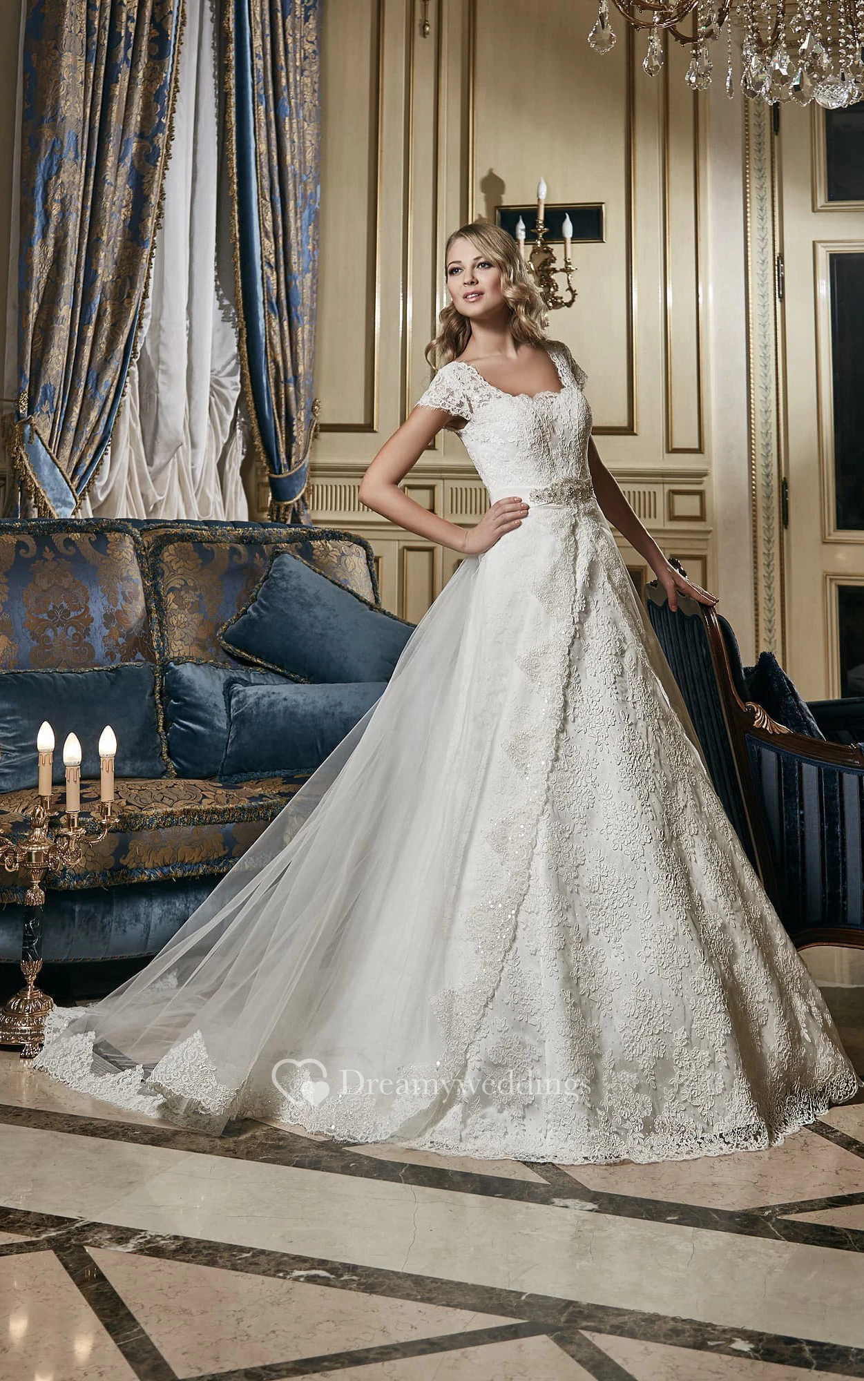 A-Line Long Square-Neck Cap-Sleeve Lace-Up Lace Dress With Beaded