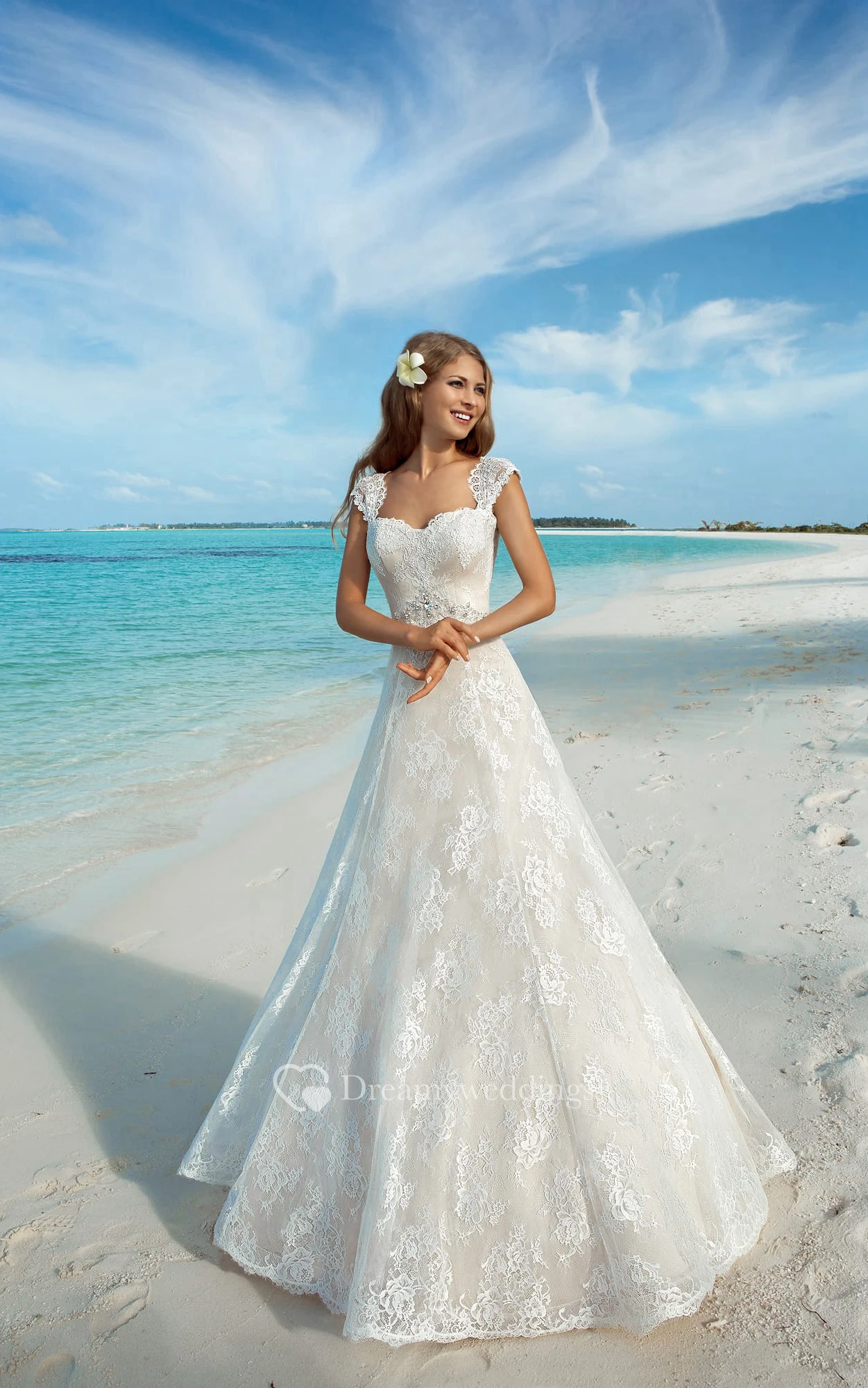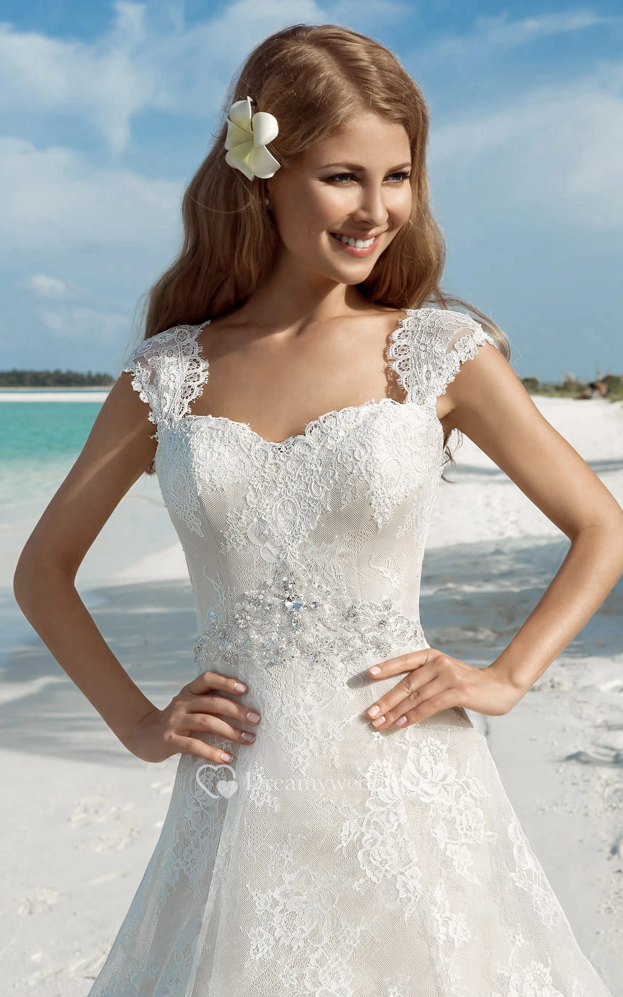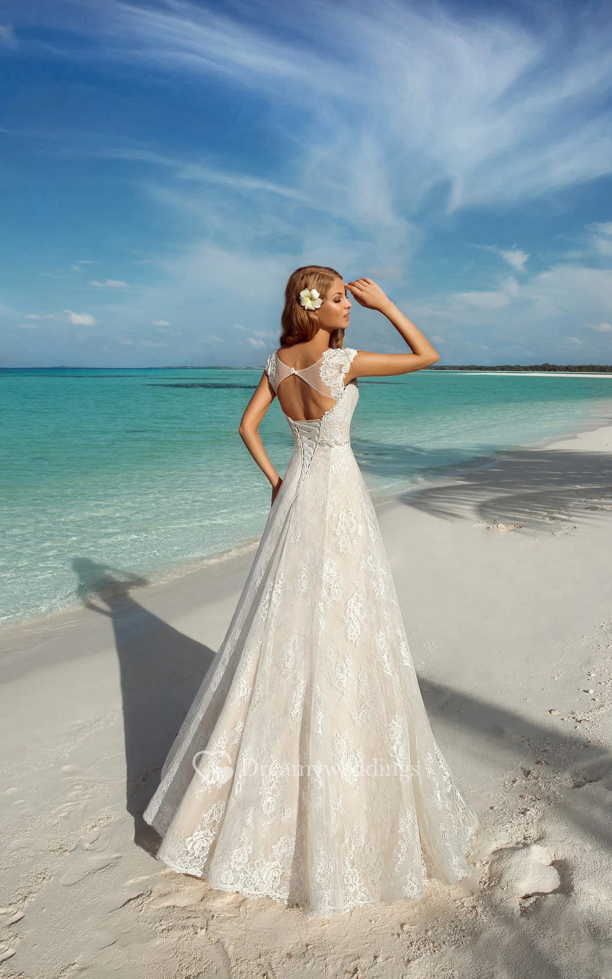 A-Line Long Square-Neck Cap-Sleeve Lace-Up Lace Dress With Beading And Keyhole