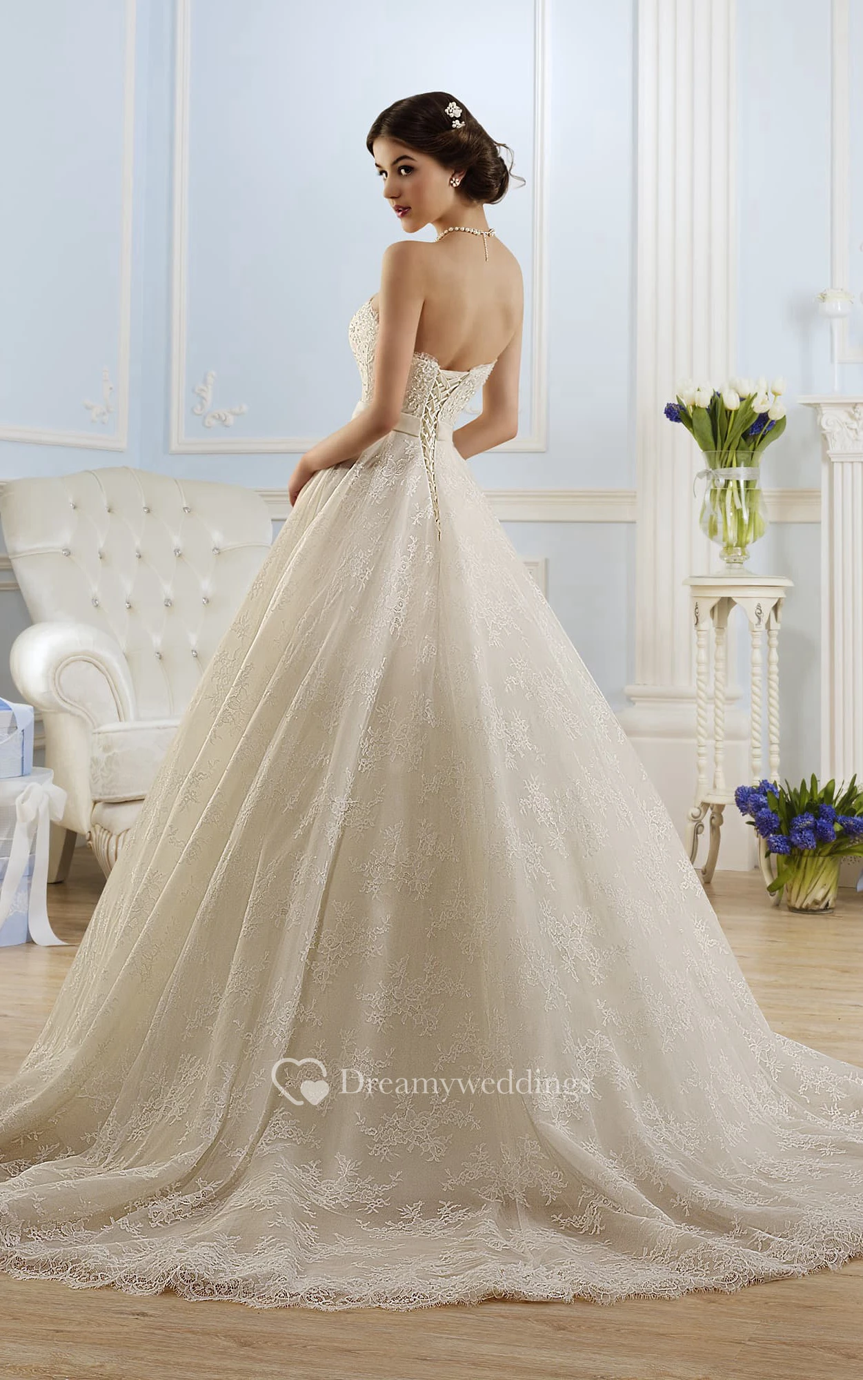 A-Line Long Strapless Sleeveless Backless Lace Dress With Waist Jewellery And Pleats