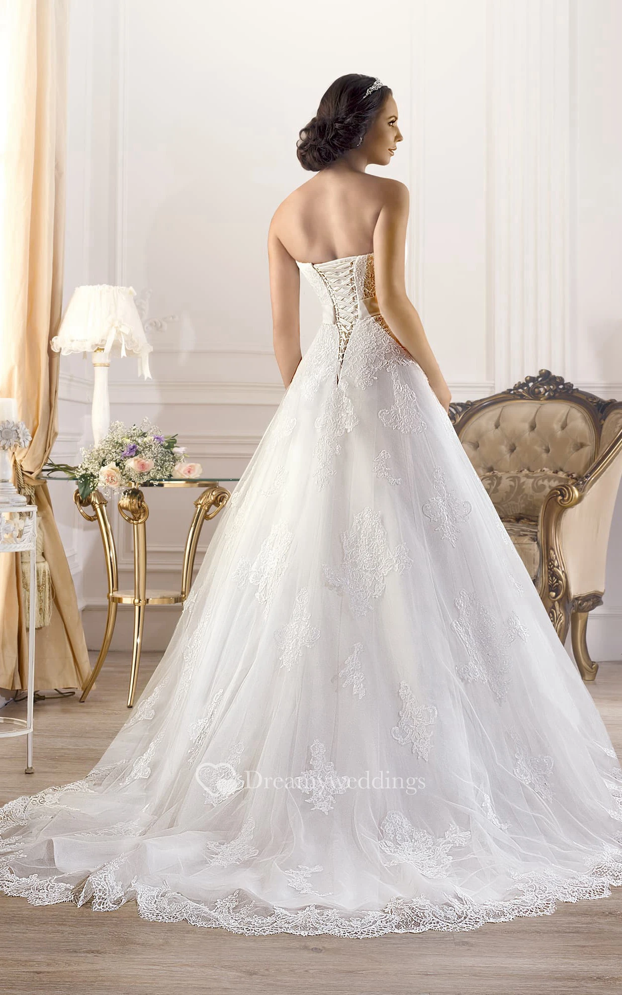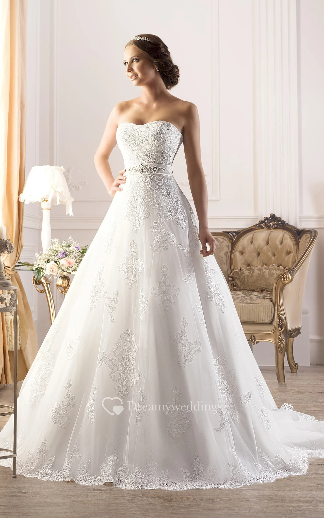 A-Line Long Strapless Sleeveless Corset-Back Lace Dress With Appliques And Waist Jewellery