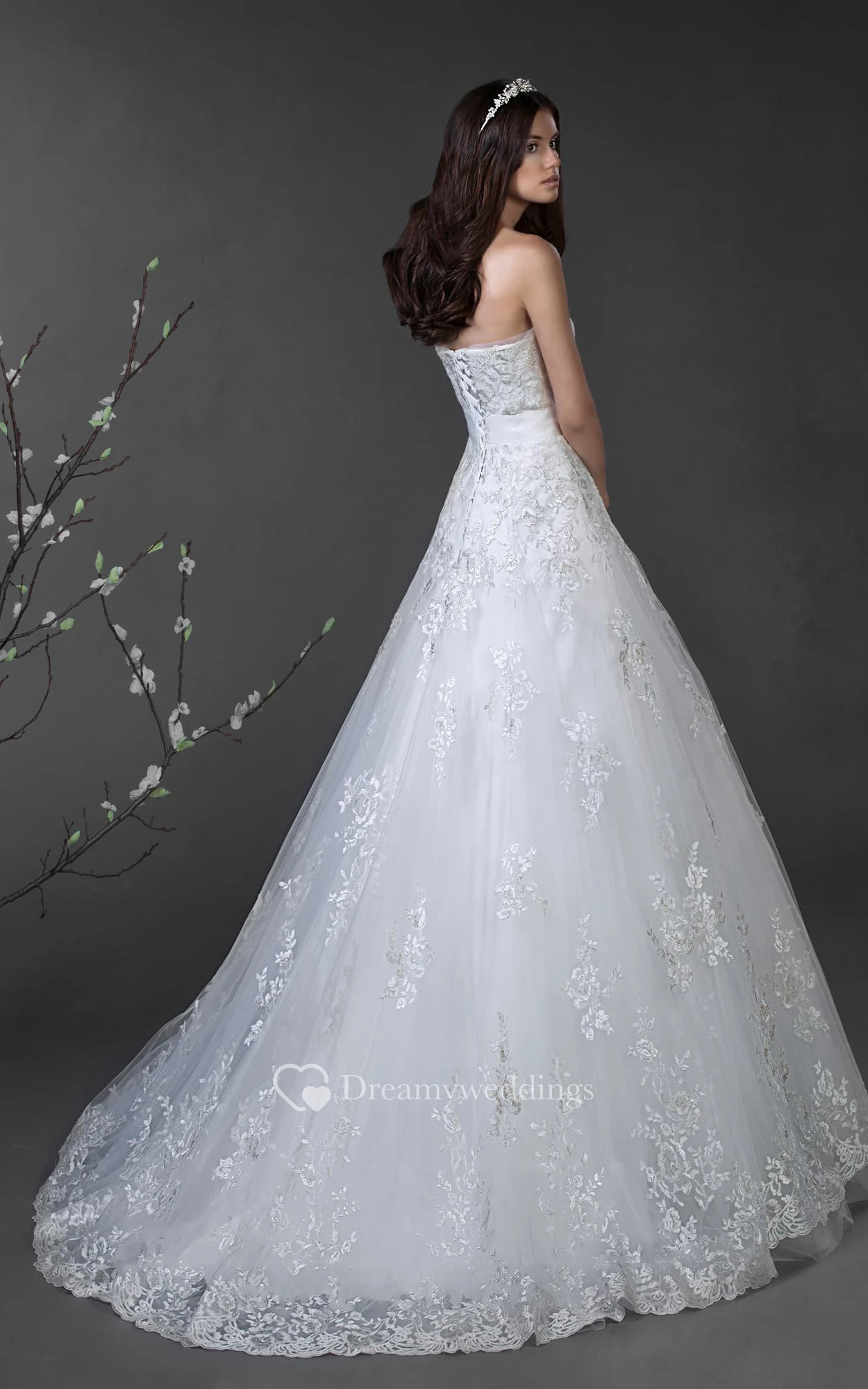 A-Line Long Strapless Sleeveless Lace-Up Lace Dress With Bow And Appliques