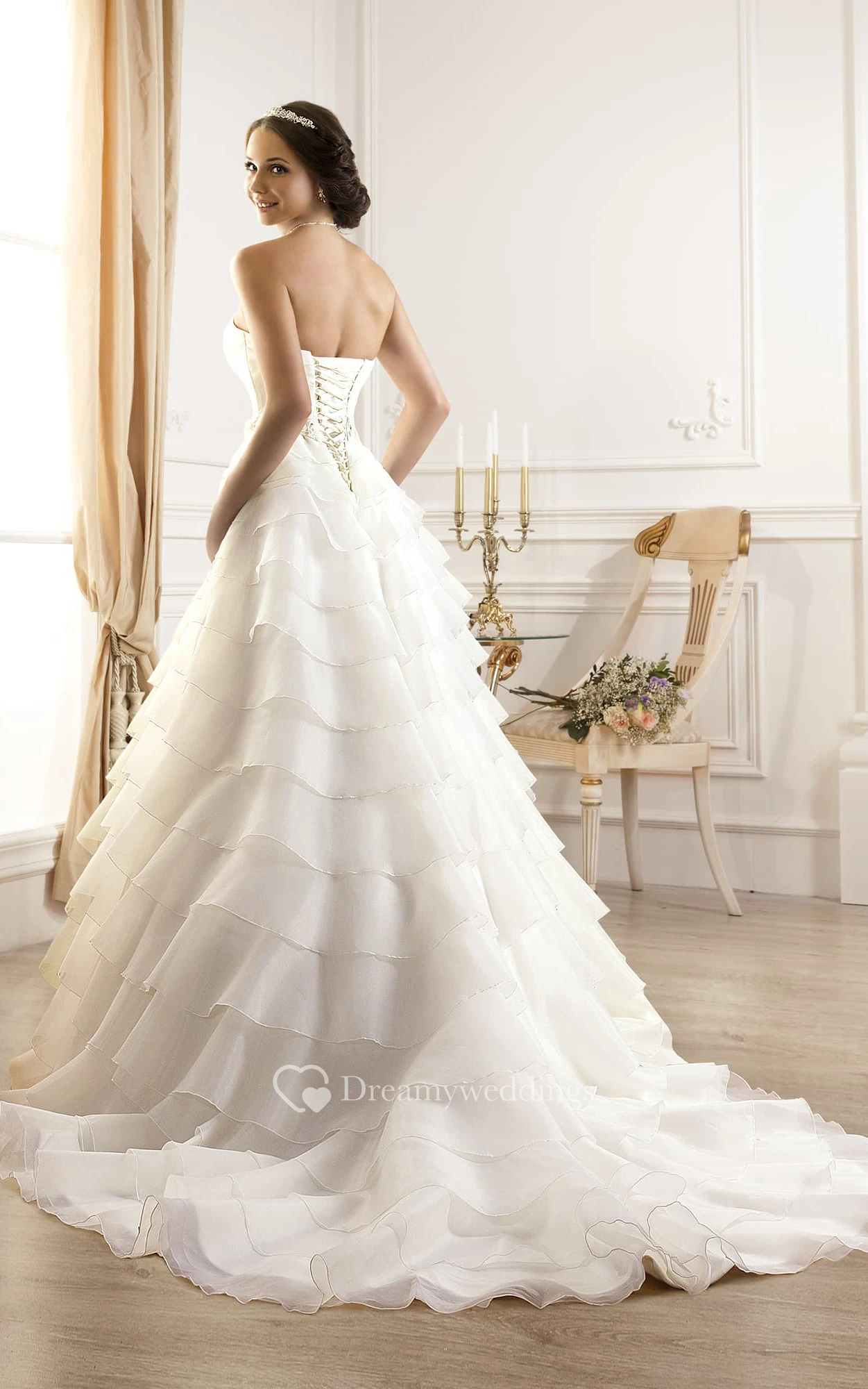 A-Line Long Strapless Sleeveless Lace-Up Organza Dress With Tiers And Flower