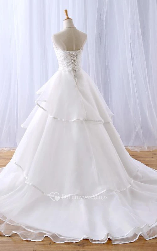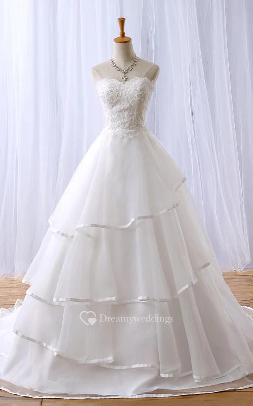 A-Line Long Sweetheart Appliques Chapel Train Zipper Lace-Up Back Tulle Lace Dress