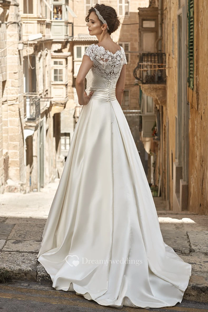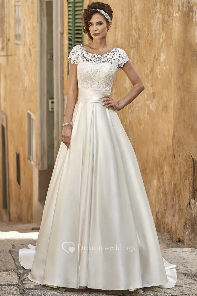A-Line Maxi Short-Sleeve Square-Neck Lace Satin Wedding Dress