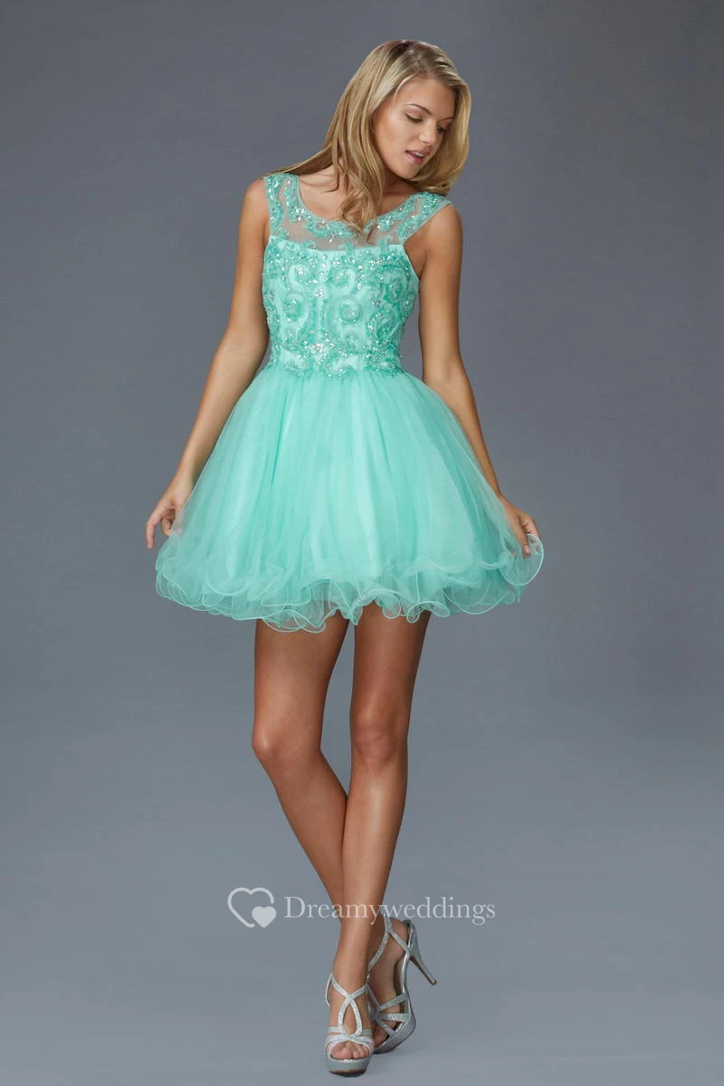 A-Line Mini Bateau Sleeveless Tulle Low-V Back Dress With Sequins And Beading
