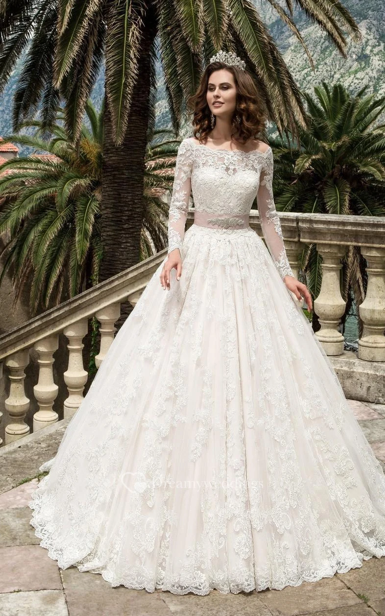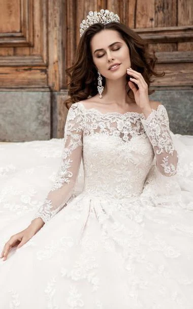 A-Line Mini Off-The-Shoulder Long Sleeve Bell Pleats Beading Appliques Court Train Button Lace Dress