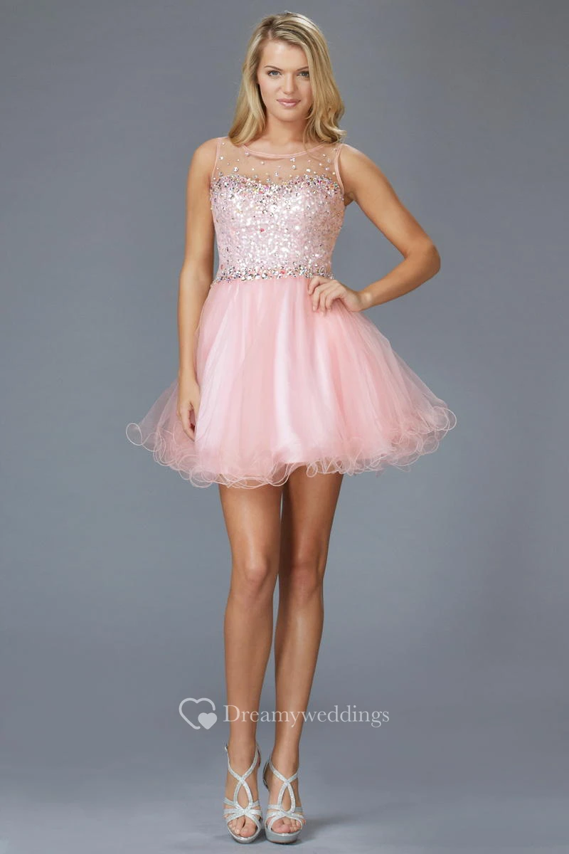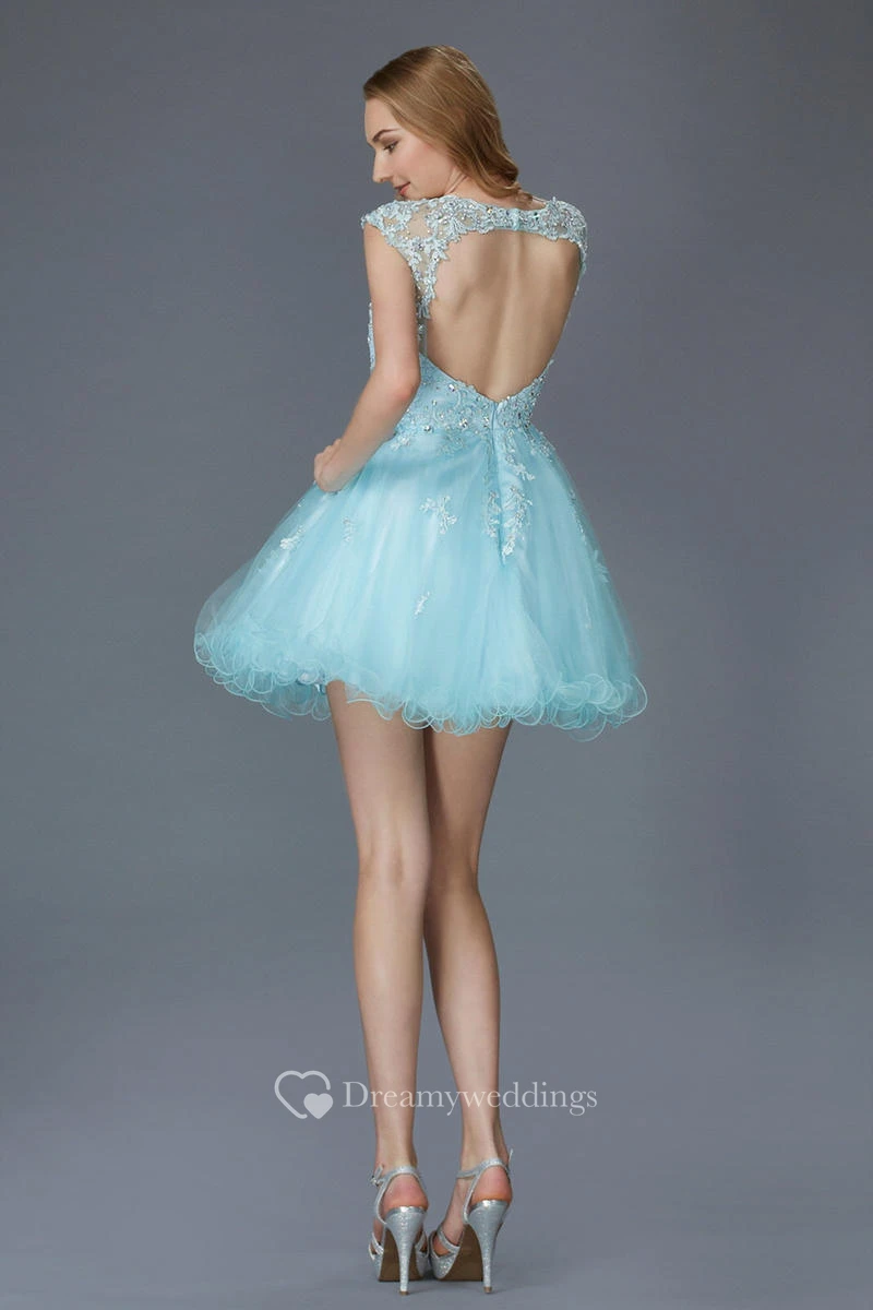 A-Line Mini Scoop-Neck Sleeveless Tulle Keyhole Dress With Beading And Ruffles