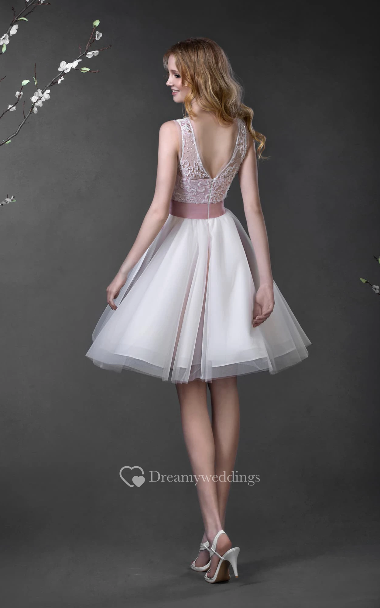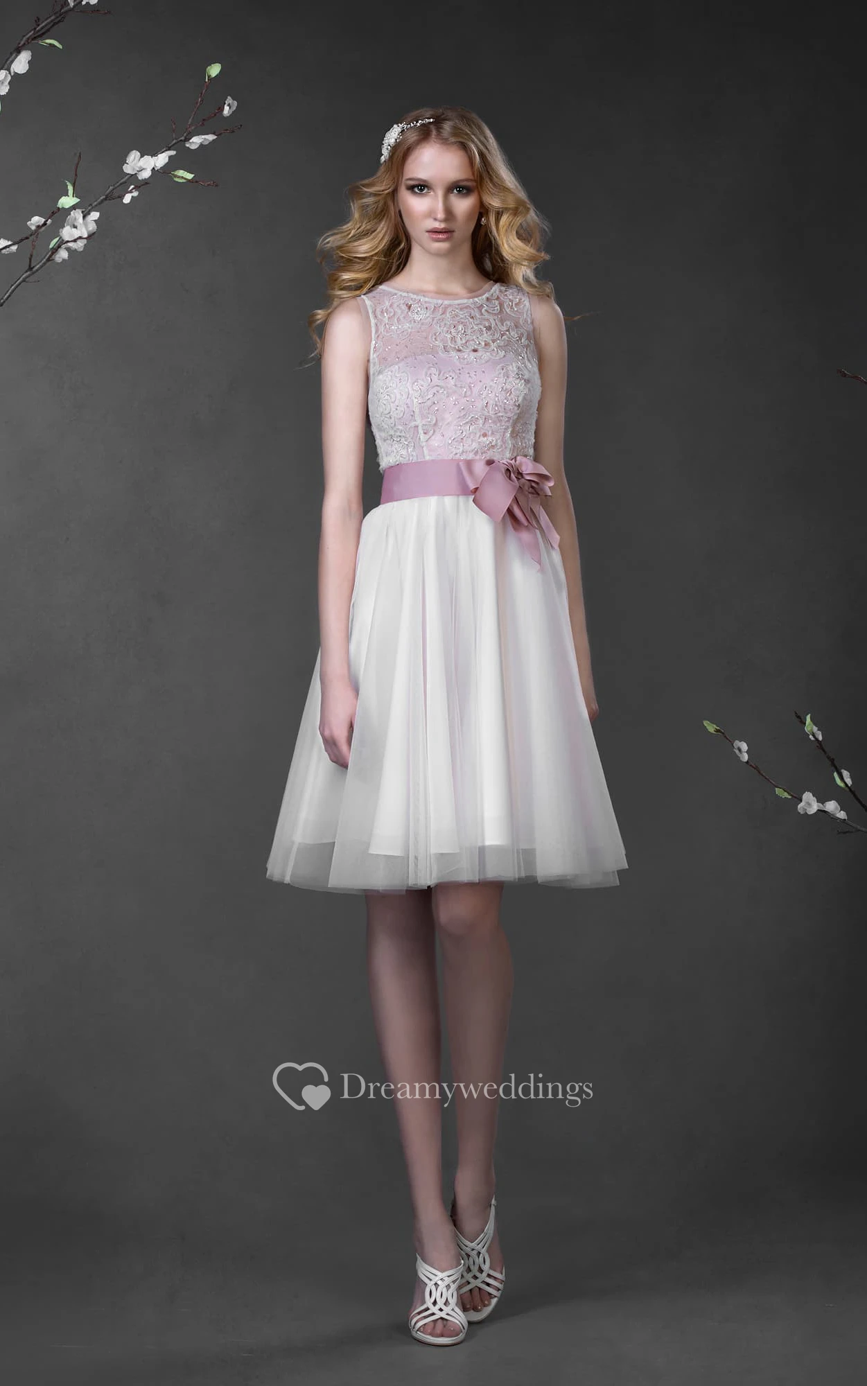 A-Line Mini Scoop Sleeveless Low-V-Back Lace Tulle Dress With Bow