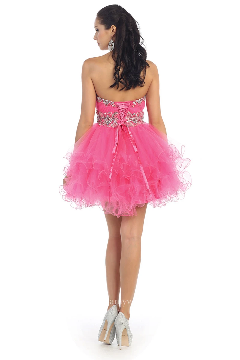 A-Line Mini Strapless Sleeveless Tulle Corset Back Dress With Ruffles And Beading