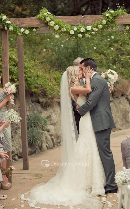 Beautiful gown! Easy and affordable choice for my wedding day! Keep in mind that it is shown as a custom fit. So, if ordering in a generic size, expect alterations in an area or two.