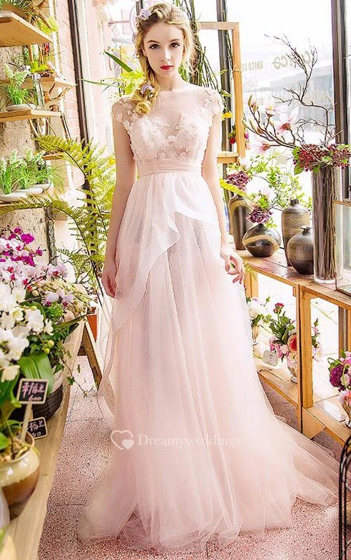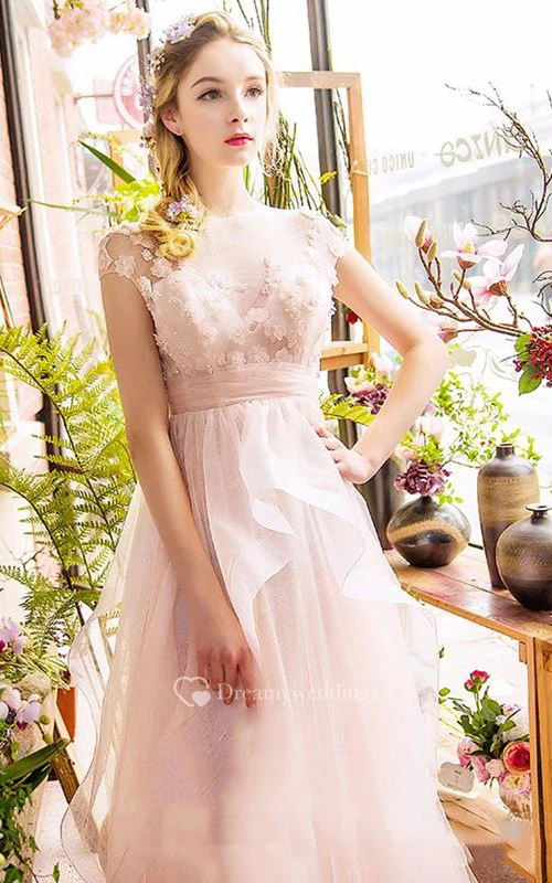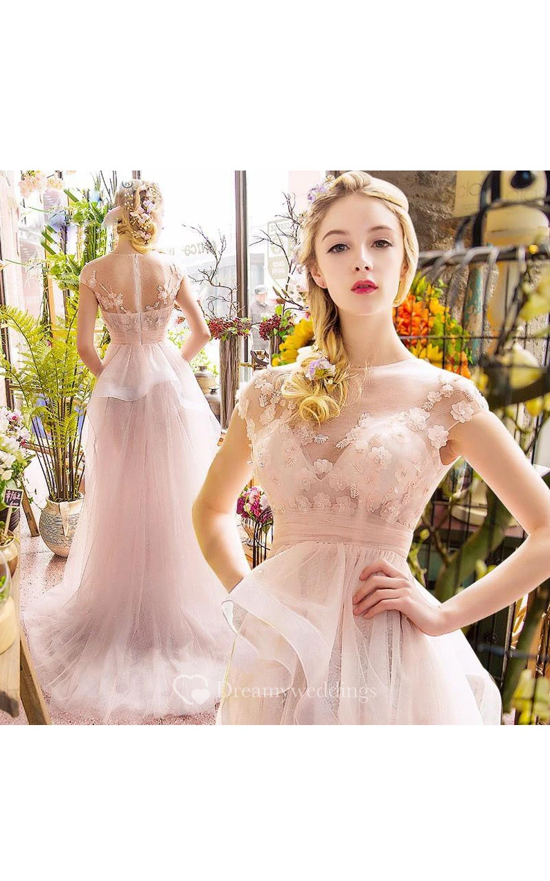 A-Line Off-the-Shoulder Appliques Beading Ruched Tiered Sweep Train Prom Dress