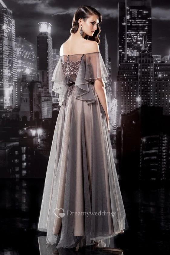 A-Line Off-The-Shoulder Short Sleeve Tulle Illusion Dress With Appliques And Pleats