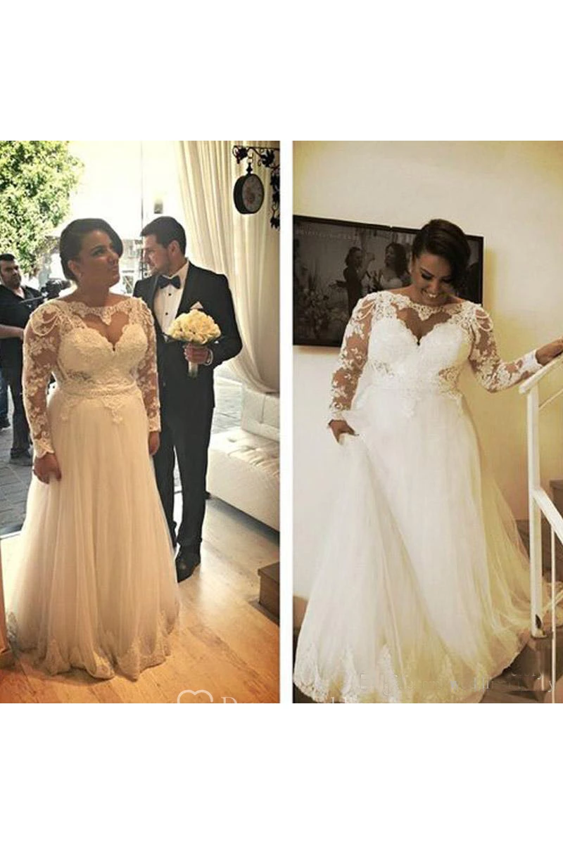 A Line Plus Size Lace Appliques Top Illusion Long Sleeves Bridal Gown with Pearls