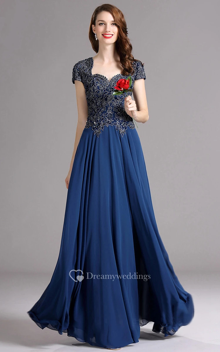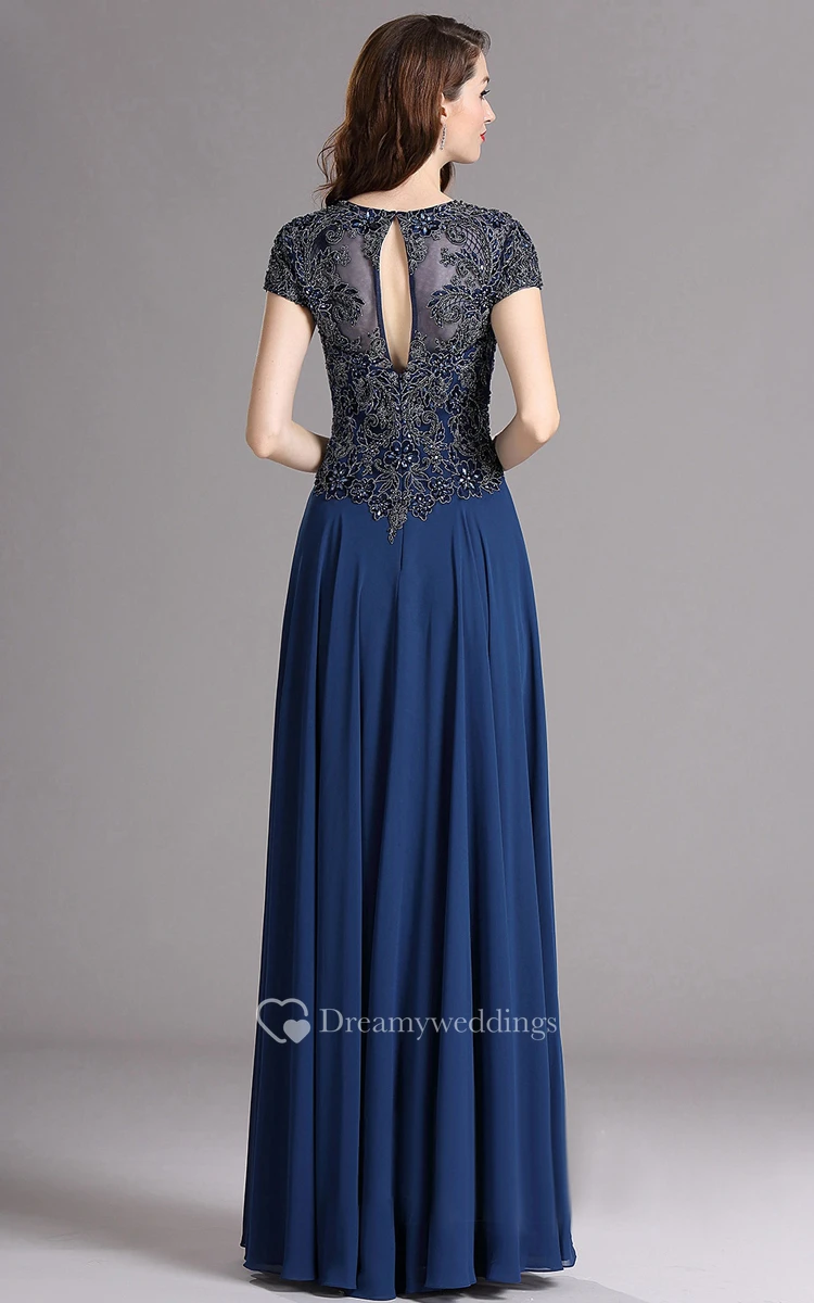 A-Line Queen Anne Short Sleeve Empire Chiffon Appliques Keyhole Dress