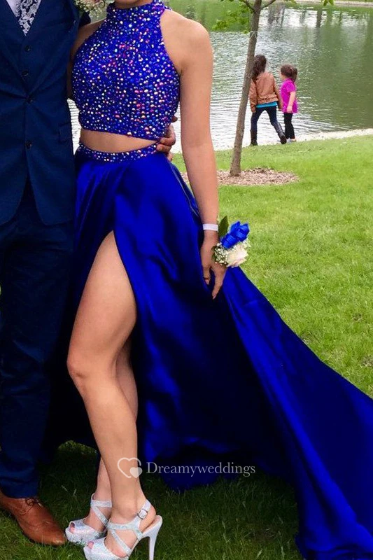 A-Line Satin Sequins Halter Sleeveless Zipper Dress