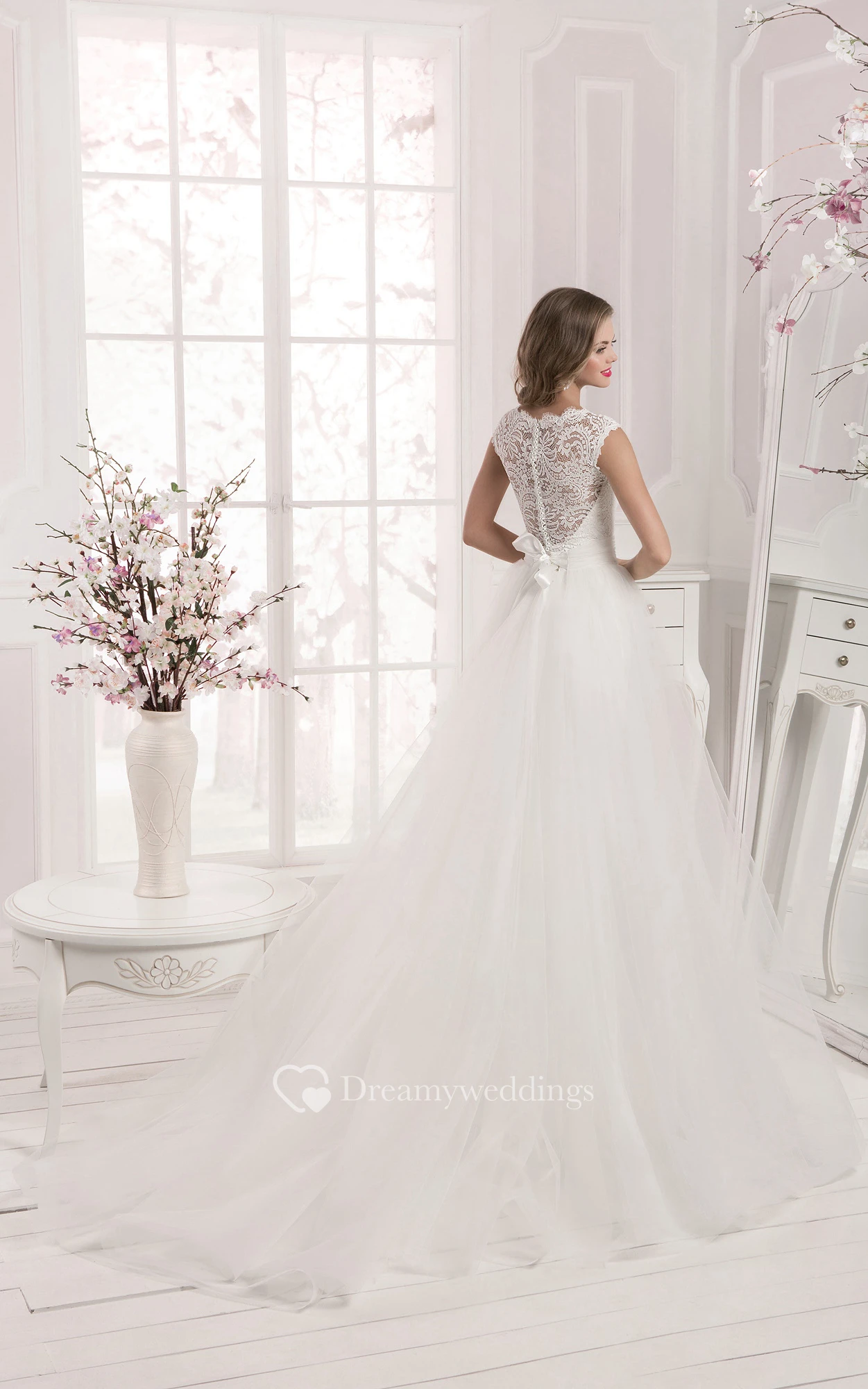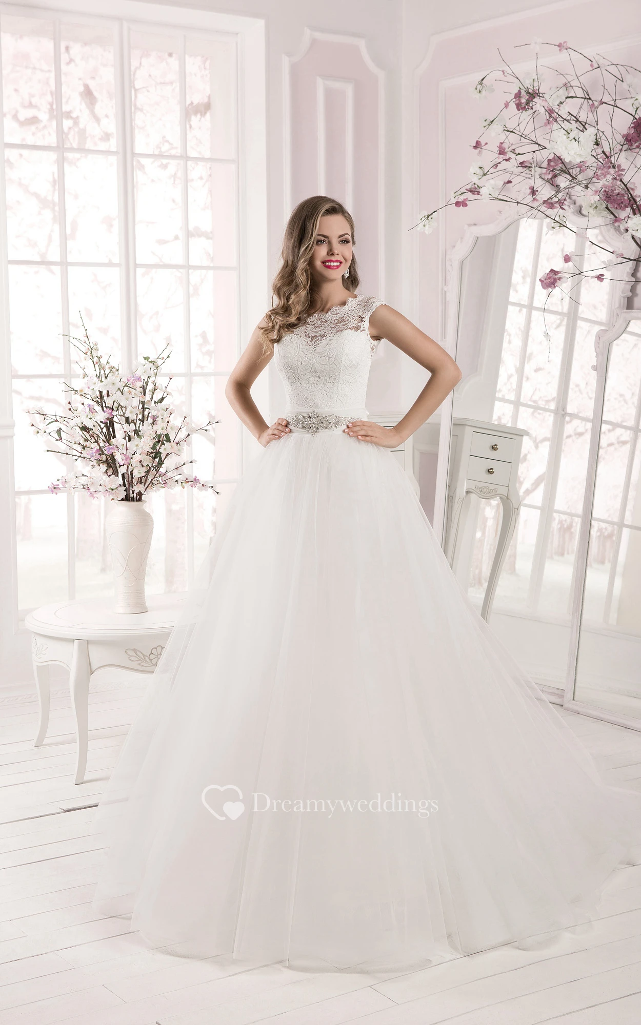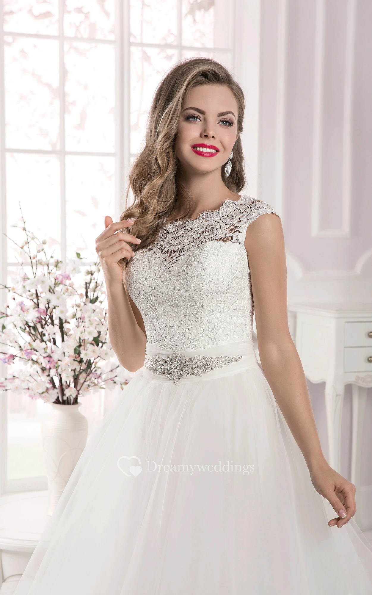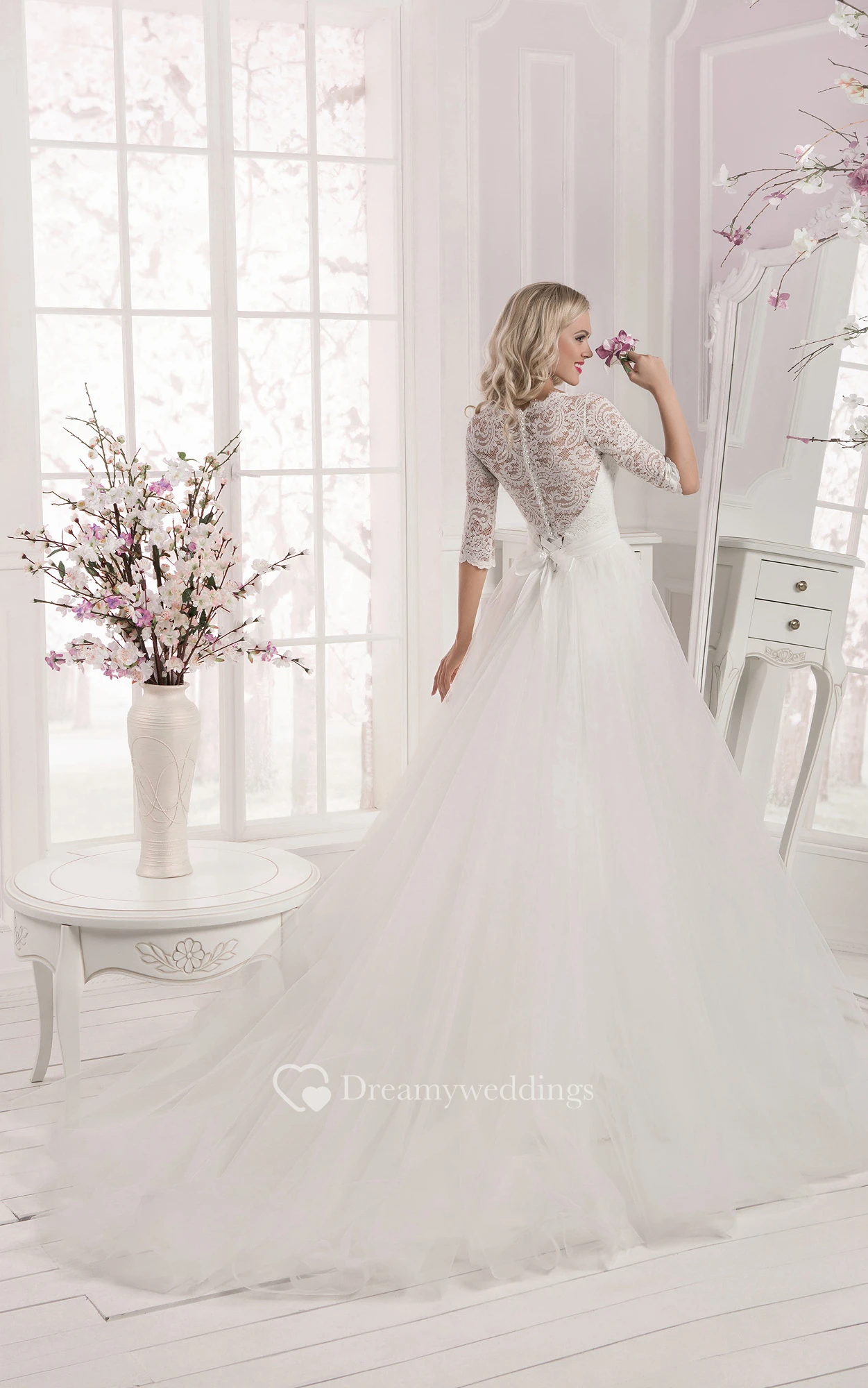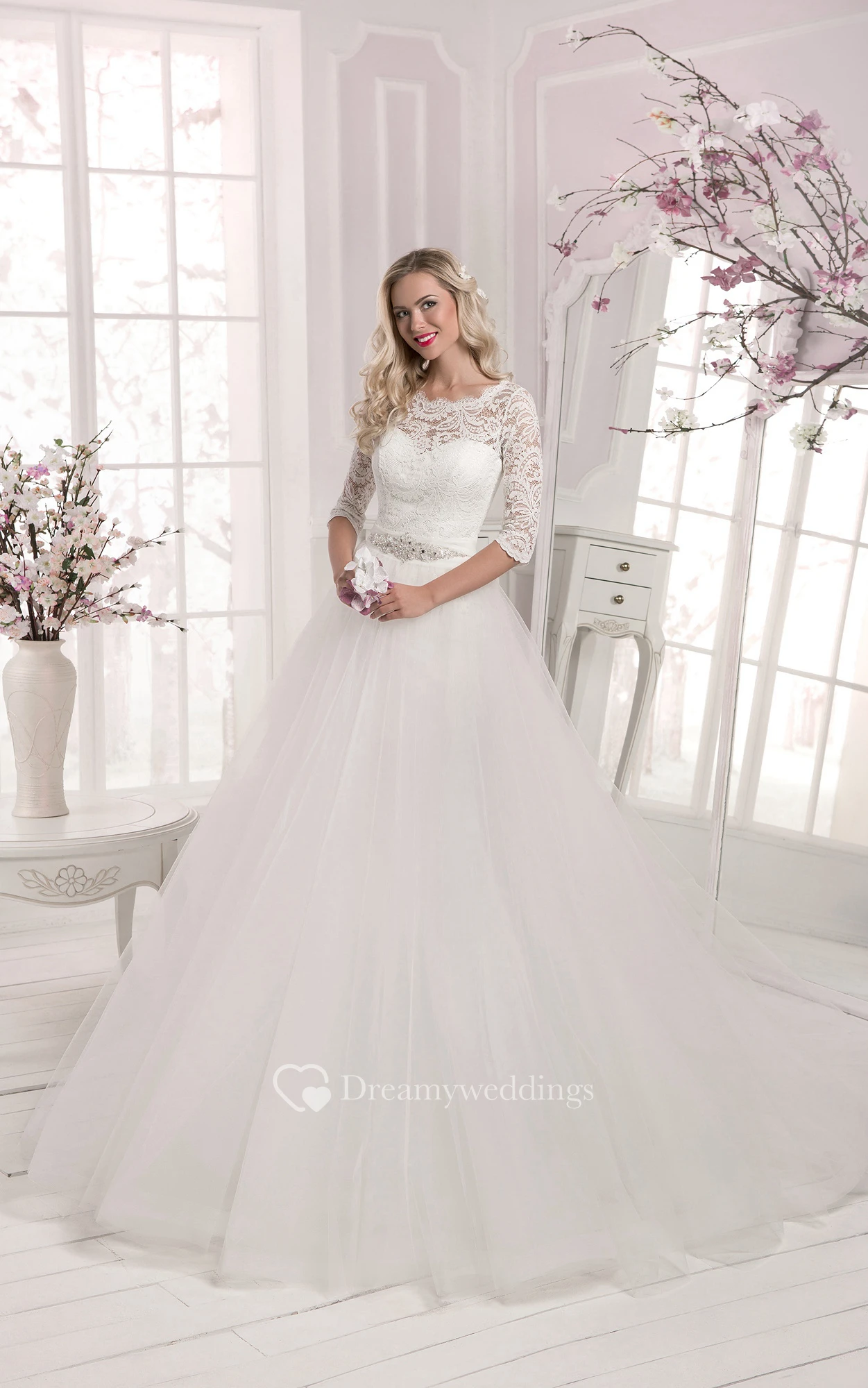 A Line Scalloped Neckline Long Sleeve Lace Top Tulle Dress with Crystal Detailing And Long Train