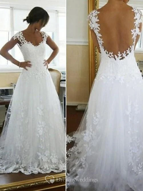 A-line Scoop Applique Chapel Train Lace Wedding Dress