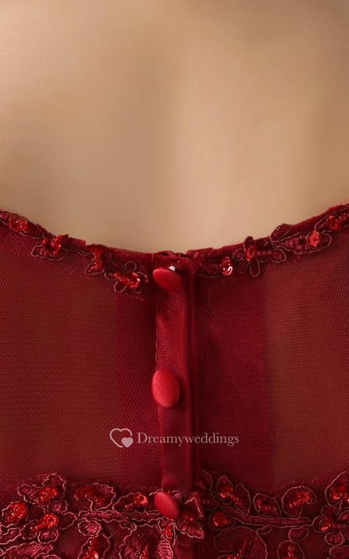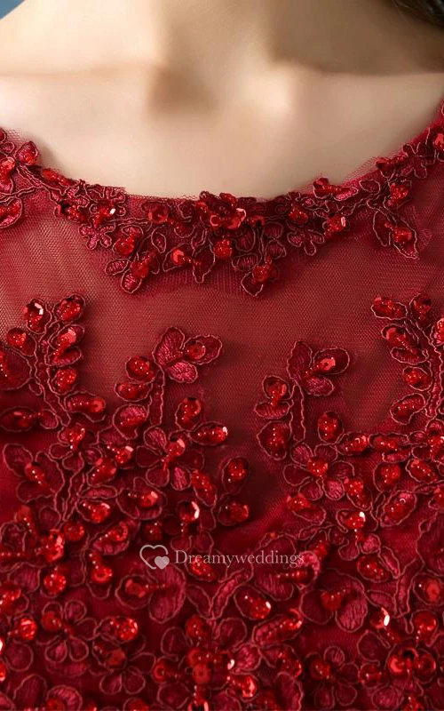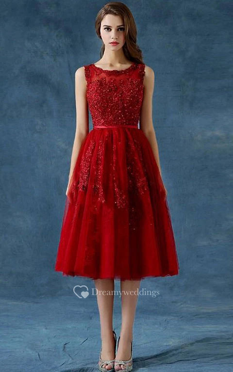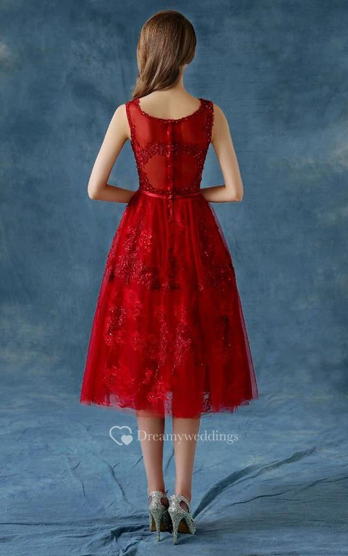 A-Line Scoop Appliques Beading Button Tea-Length Prom Dress