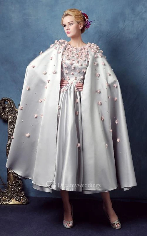 A-Line Scoop Beading Flowers Tea-Length Prom Dress