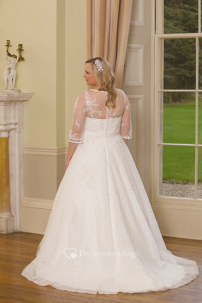 A-Line Scoop-Neck 3-4-Sleeve Lace Plus Size Wedding Dress With Illusion