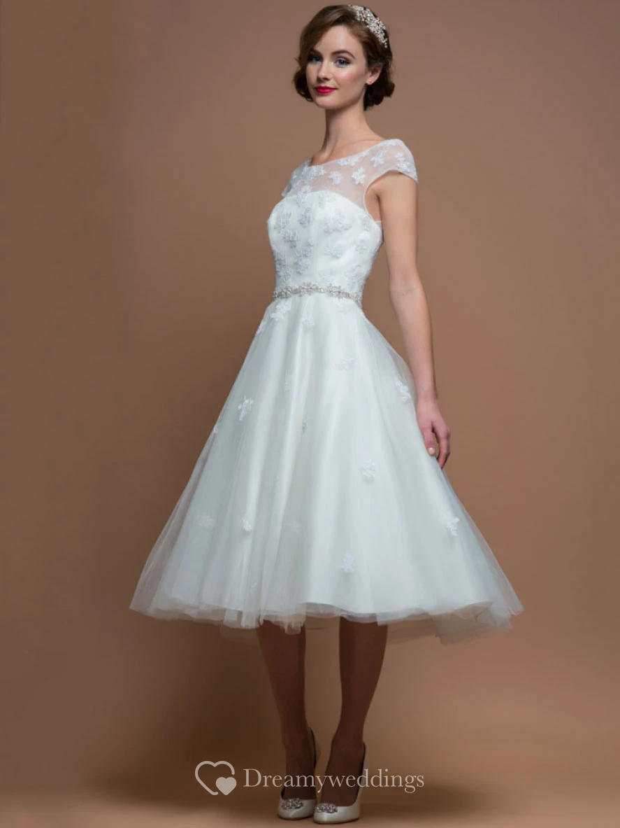 A-Line Scoop-Neck Cap-Sleeve Jeweled Tea-Length Tulle Wedding Dress