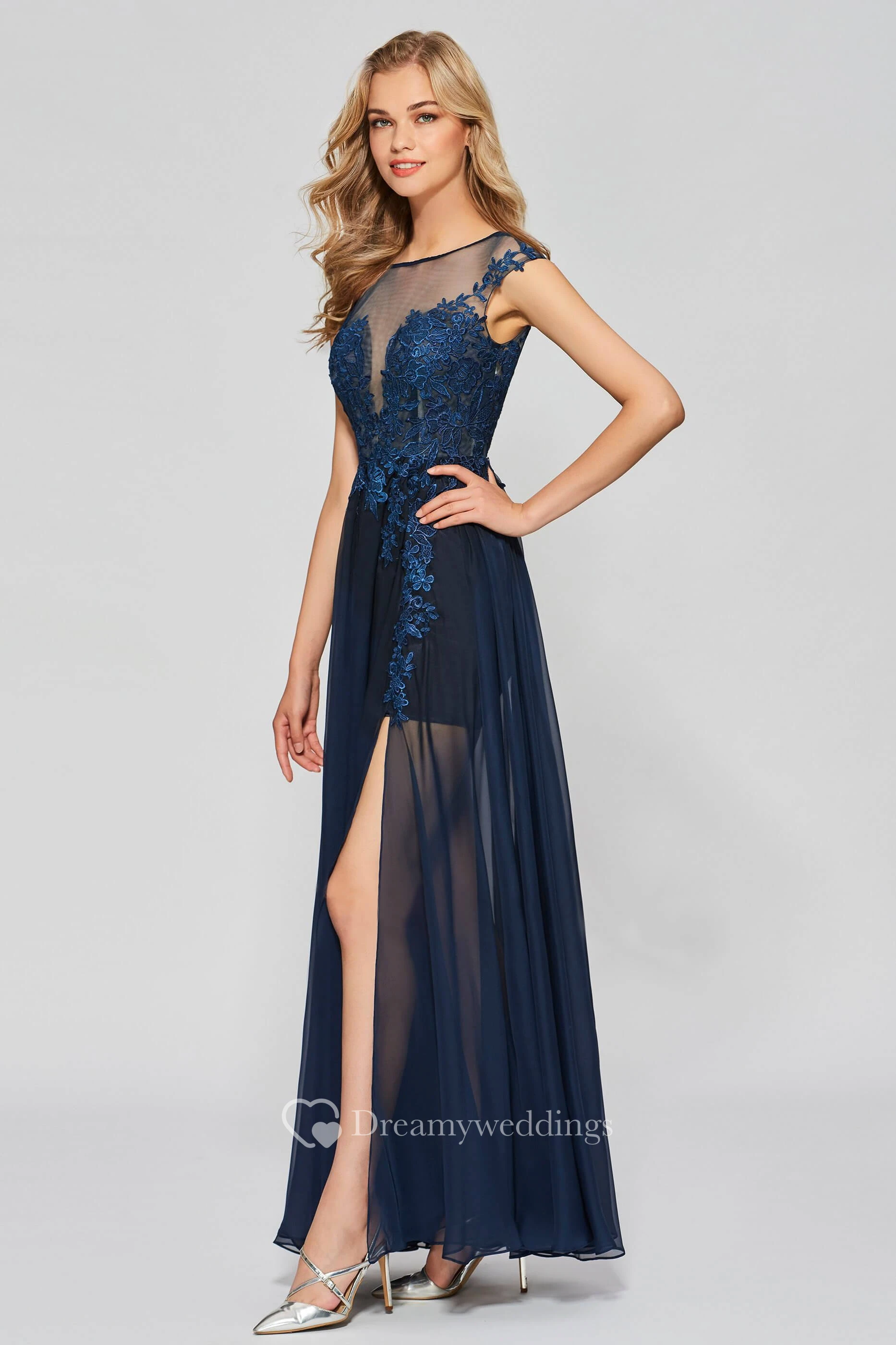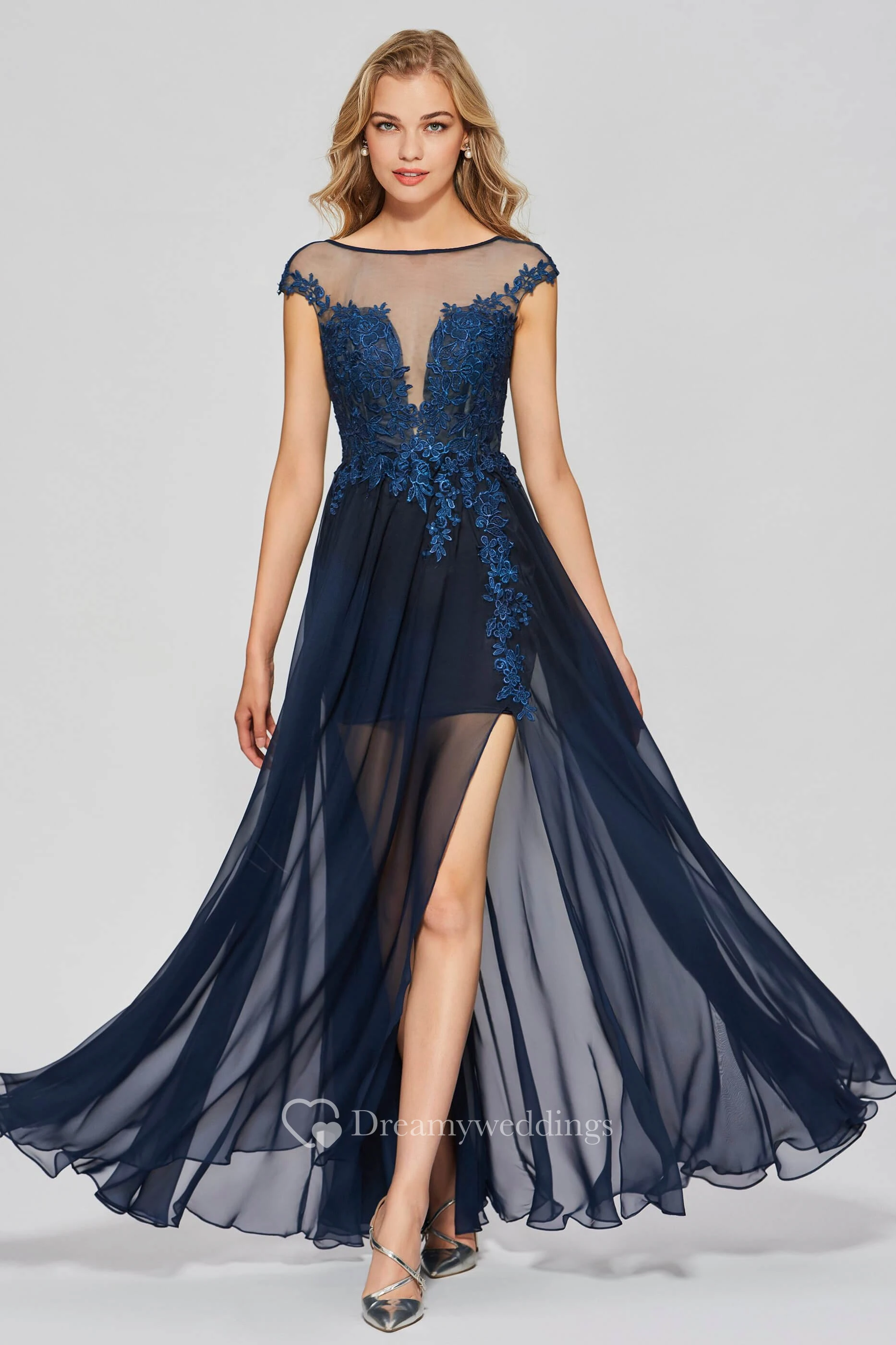 A-line Sexy Split Front Bateau Chiffon Gown With Lace Appliques And Deep V-back