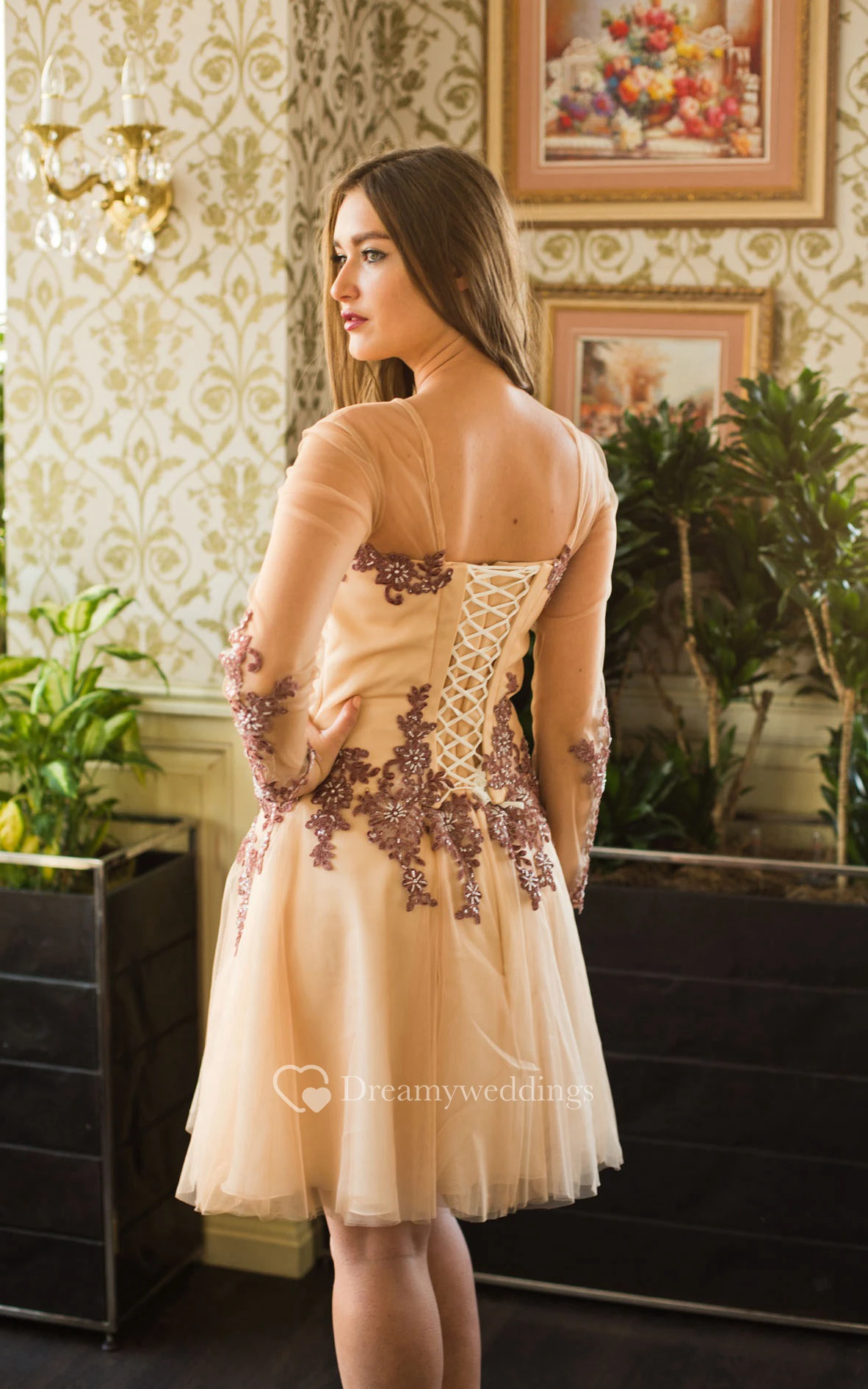 A-Line Short Bateau Long Sleeve Lace Appliques Lace-Up Dress