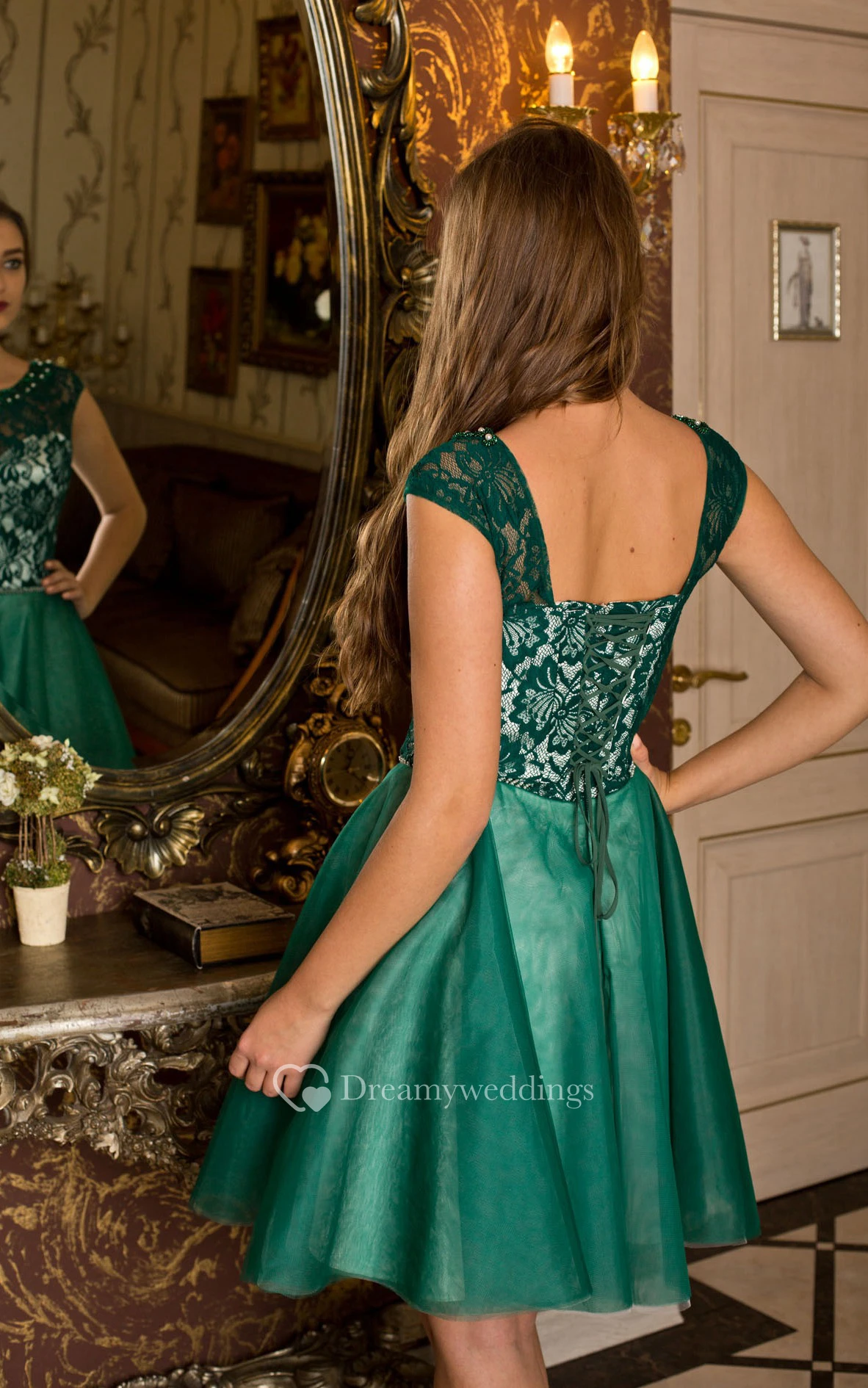 A-Line Short Bateau Short Sleeve Tulle Lace Lace-Up Dress