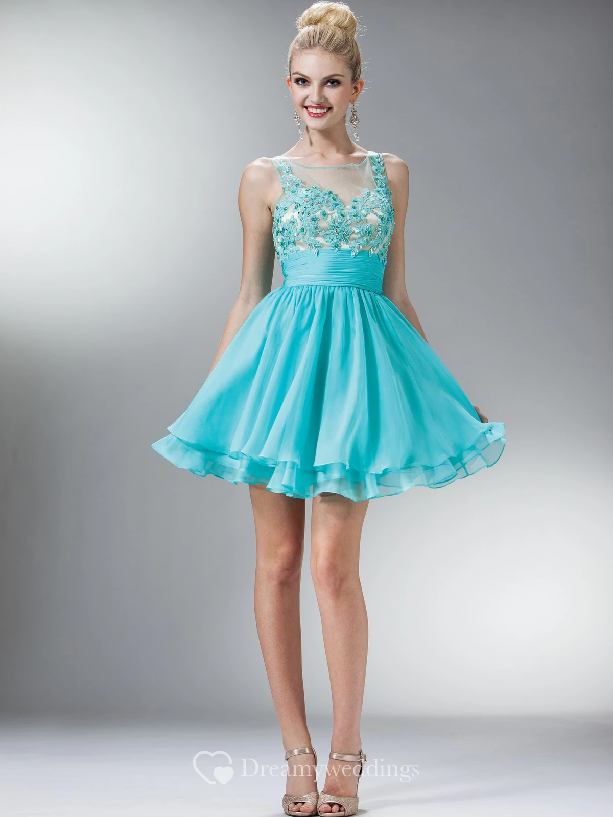 A-Line Short Bateau Sleeveless Chiffon Dress With Appliques And Tiers