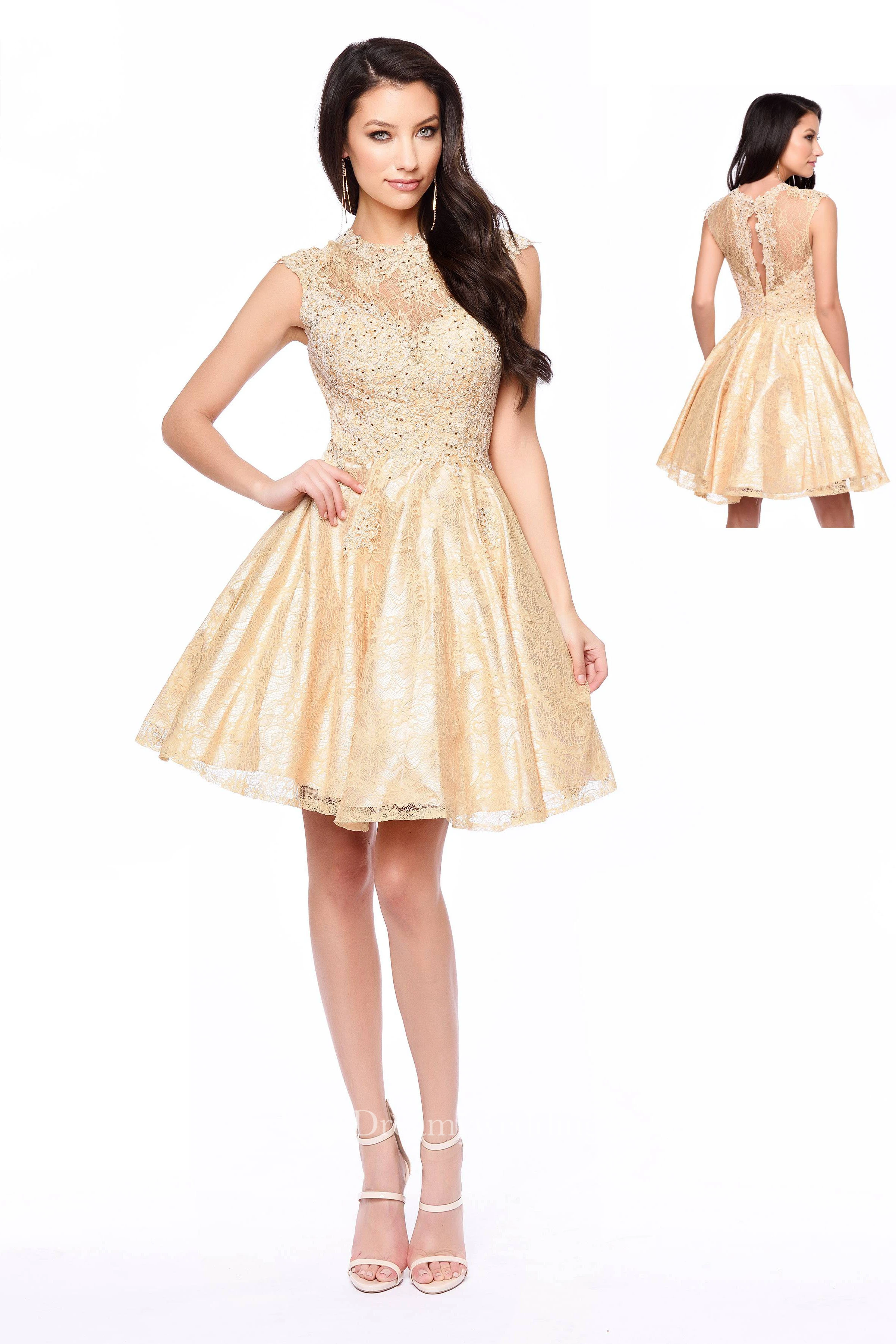 A-Line Short High Neck Cap-Sleeve Lace Illusion Dress With Appliques