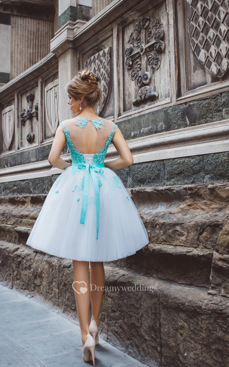 A-Line Short High-Neck Short Sleeve Tulle Appliques Pleats Keyhole Dress