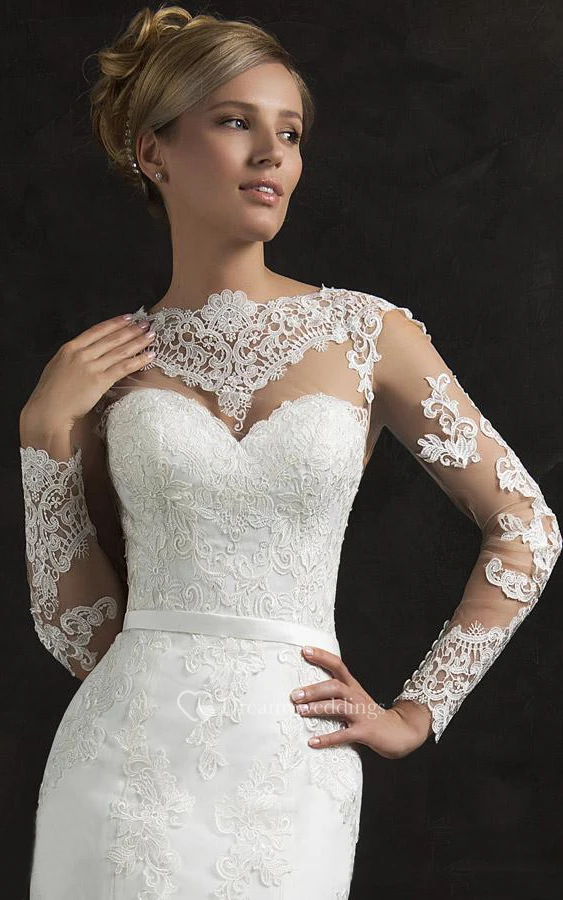 A-Line Short Long Sleeve Bell Bat Appliques Court Train Backless Keyhole Lace Satin Dress