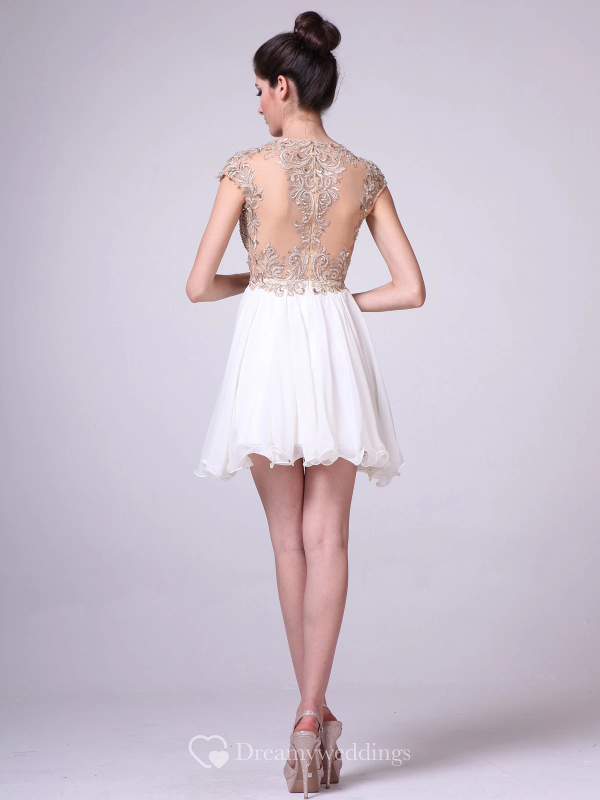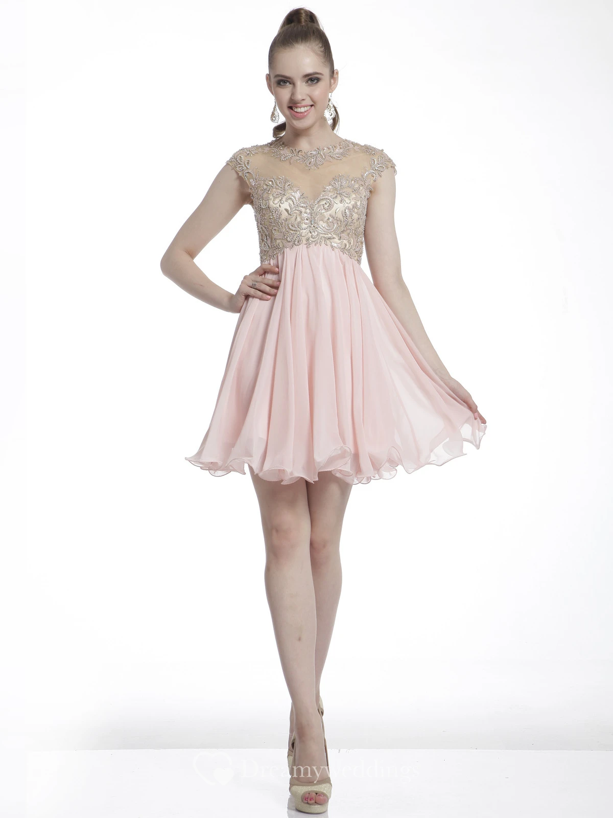 A-Line Short Scoop-Neck Cap-Sleeve Empire Illusion Dress With Beading And Pleats
