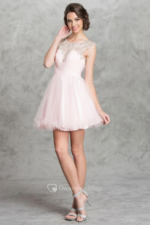 A-Line Short Scoop-Neck Cap-Sleeve Tulle Keyhole Dress With Beading And Criss Cross