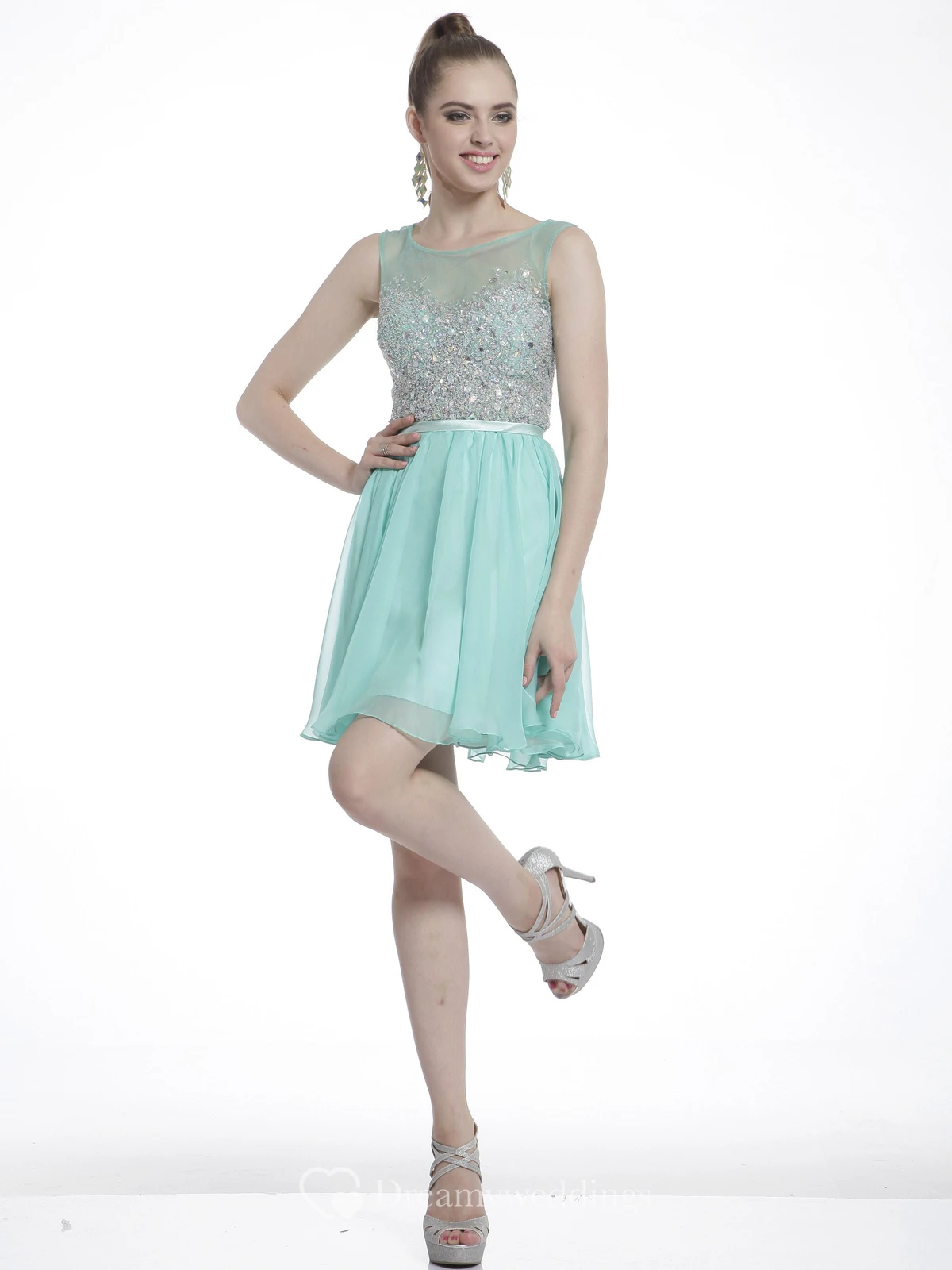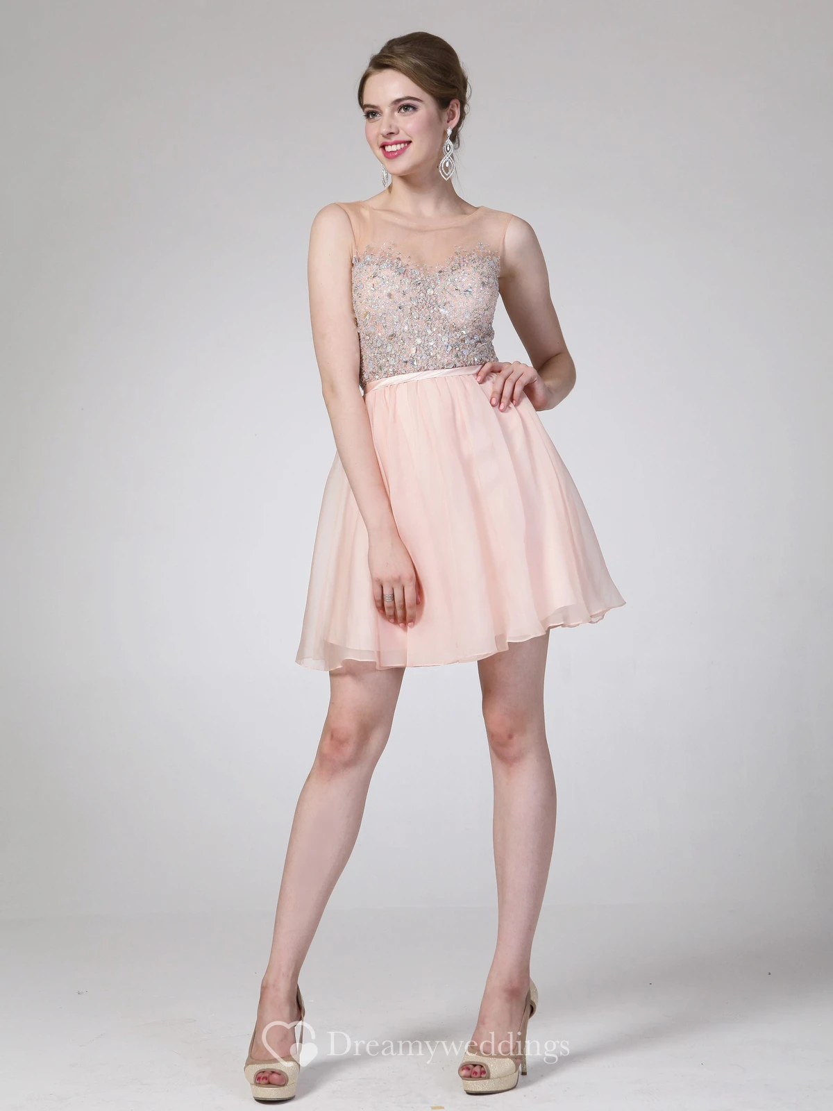 A-Line Short Scoop-Neck Sleeveless Chiffon Illusion Dress With Beading