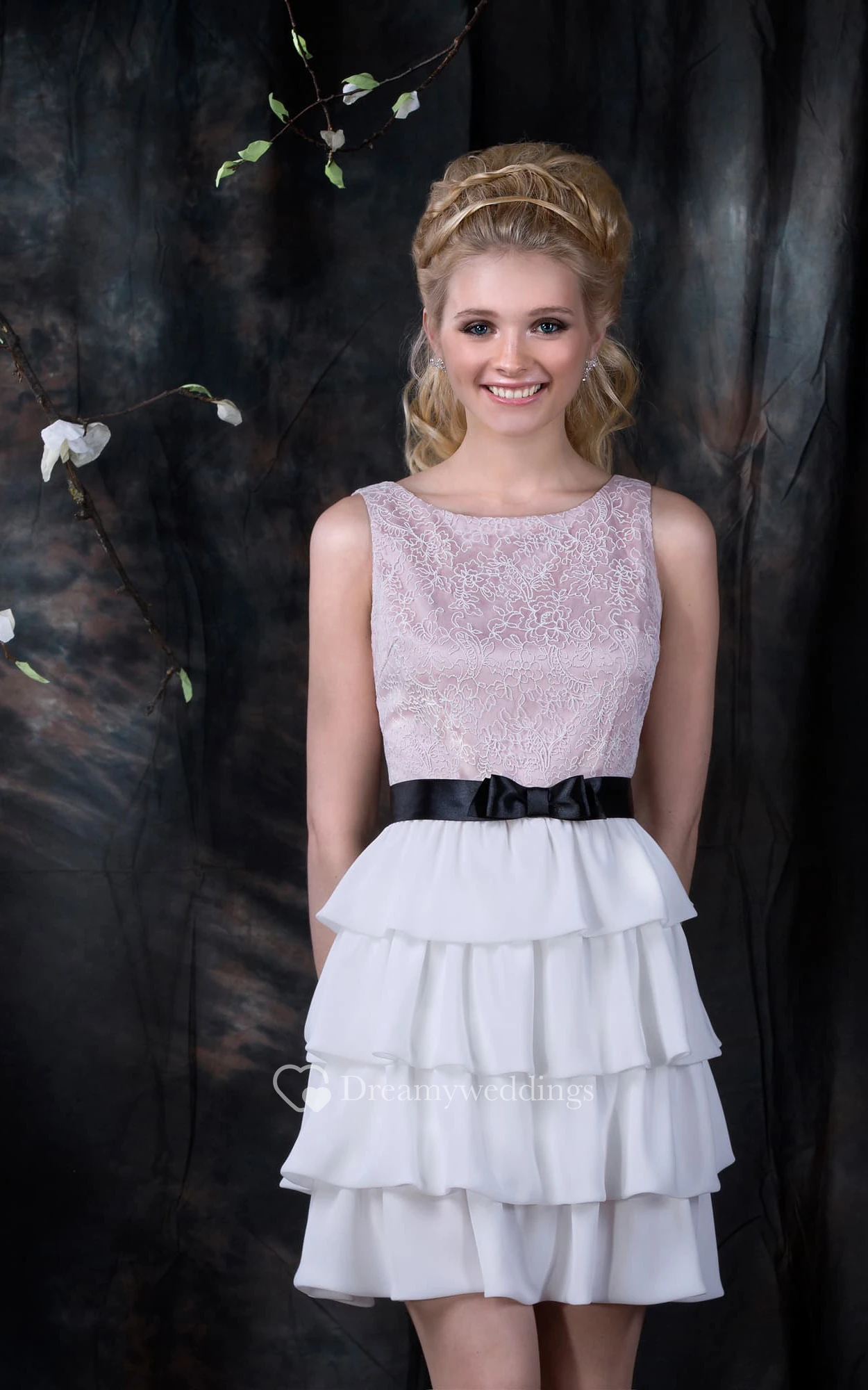 A-Line Short Scoop Sleeveless Low-V-Back Satin Lace Dress With Tiers