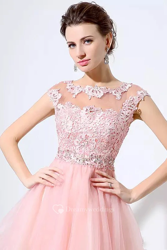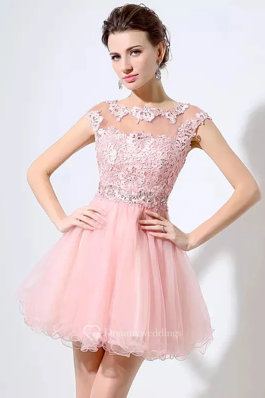 A-line Short Sleeve Lace Tulle Bateau Illusion Short Mini Homecoming Dress