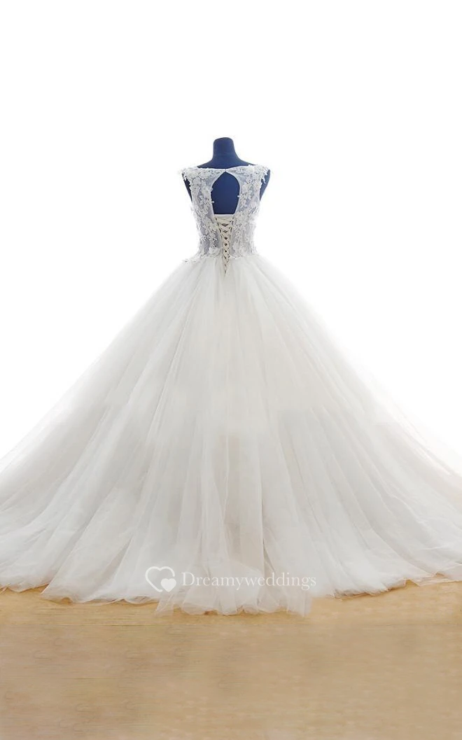 A-Line Short Sleeveless Bell Cap Bat Chapel Train Zipper Corset Back Lace Dress
