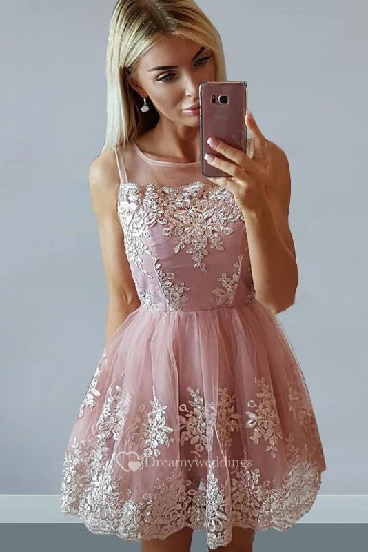 A-line Sleeveless Lace Bateau Zipper Short Mini Homecoming Dress