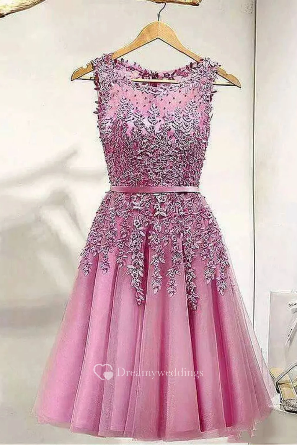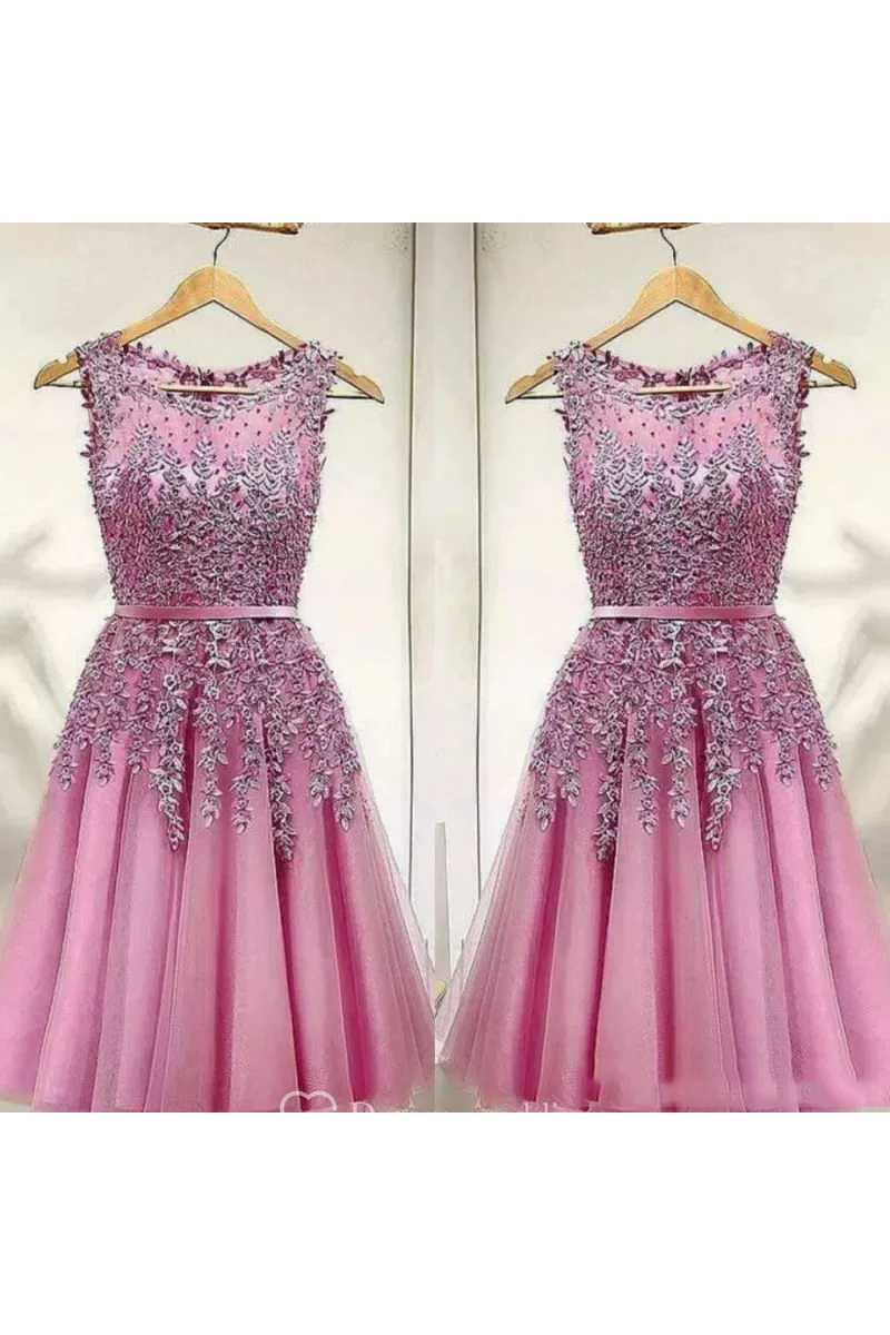 A-line Sleeveless Lace Tulle Bateau Knee-length Homecoming Dress