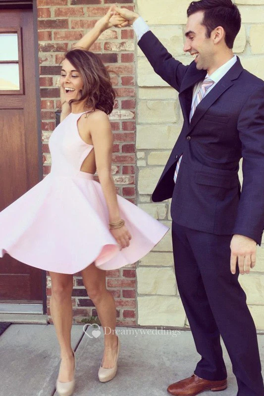 A-line Sleeveless Satin Halter Backless Zipper Straps Short Mini Homecoming Dress